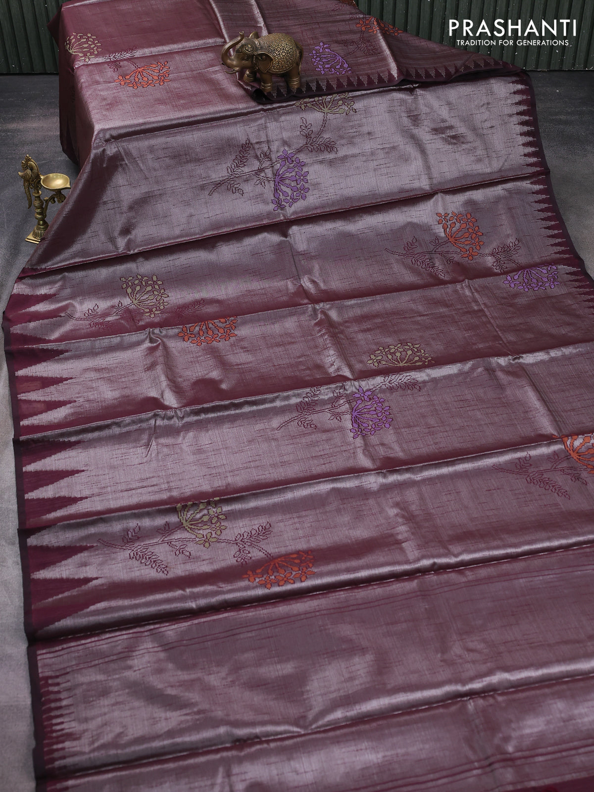 Banarasi matka tissue saree wine shade with thread woven buttas and temple design zari woven border