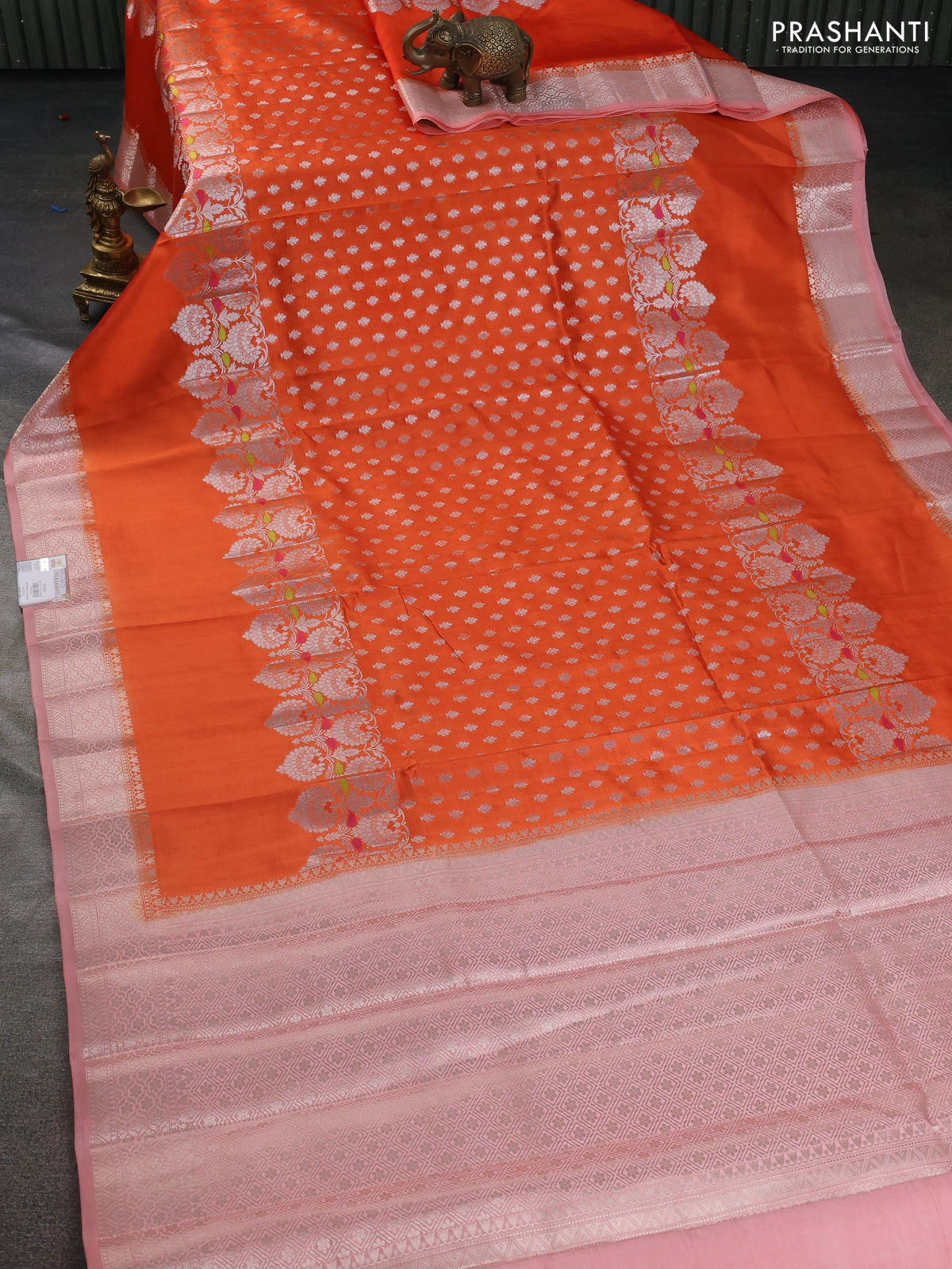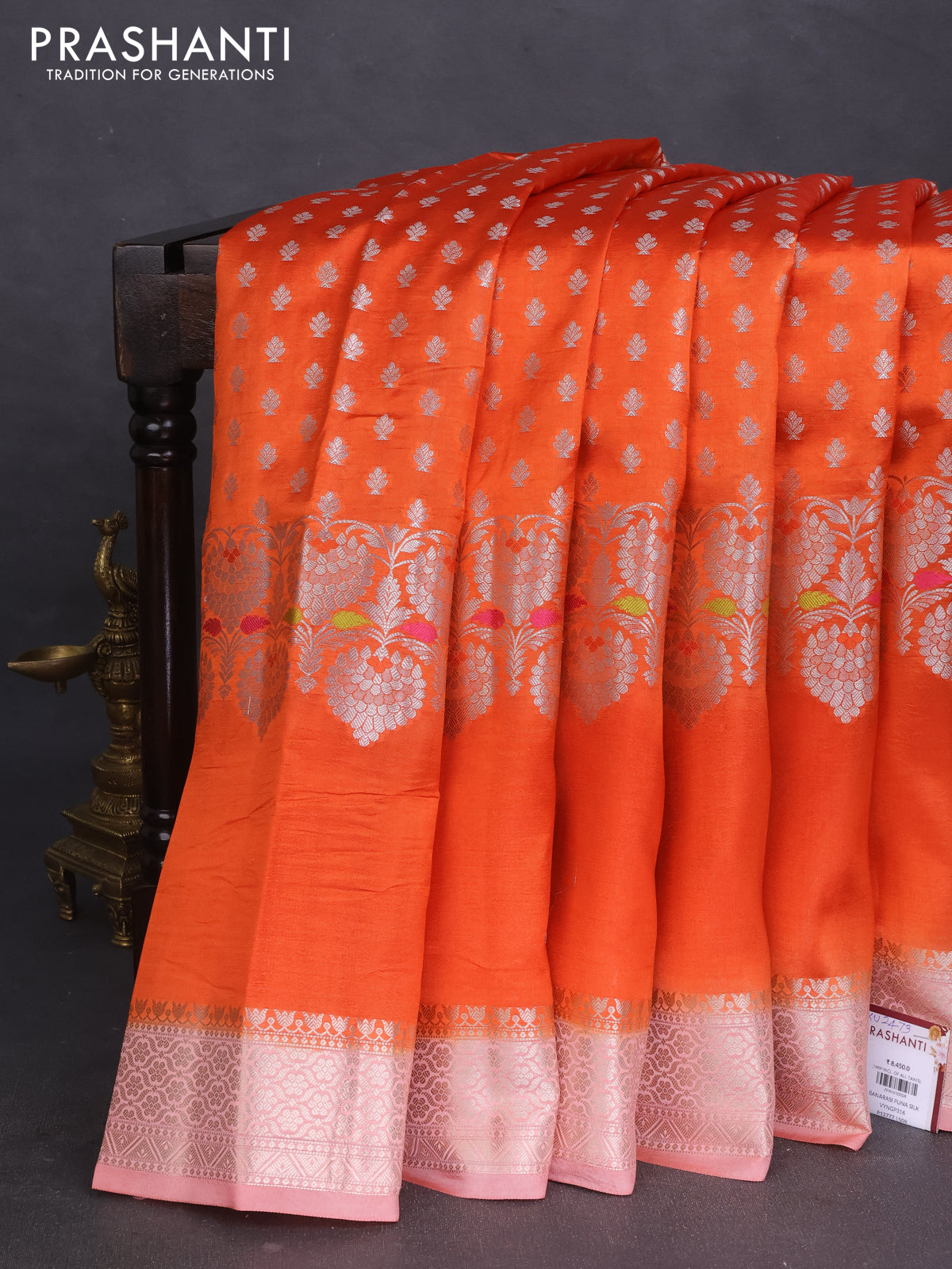 Banarasi poona silk saree orange with allover silver zari woven buttas and long rich zari woven border