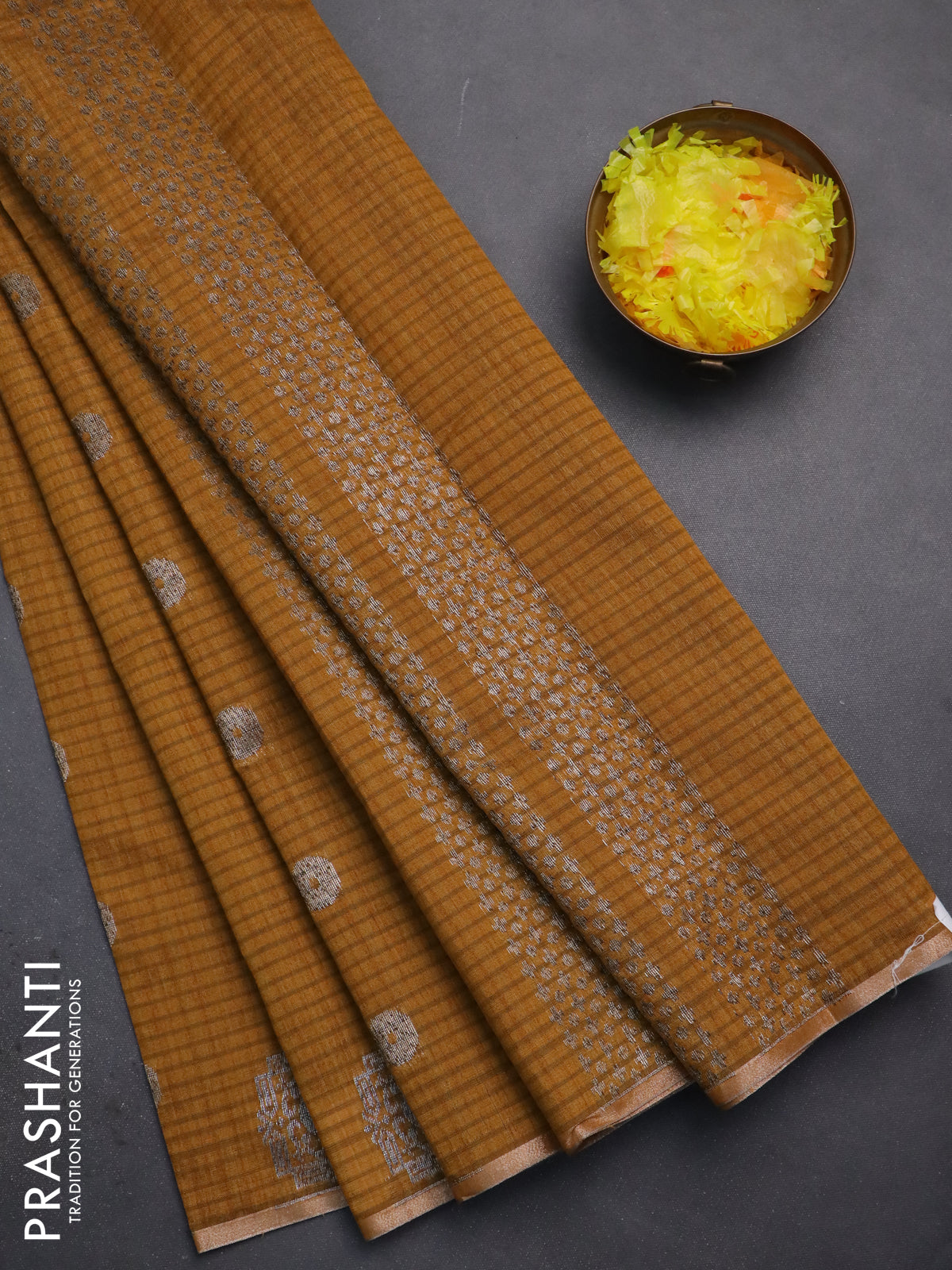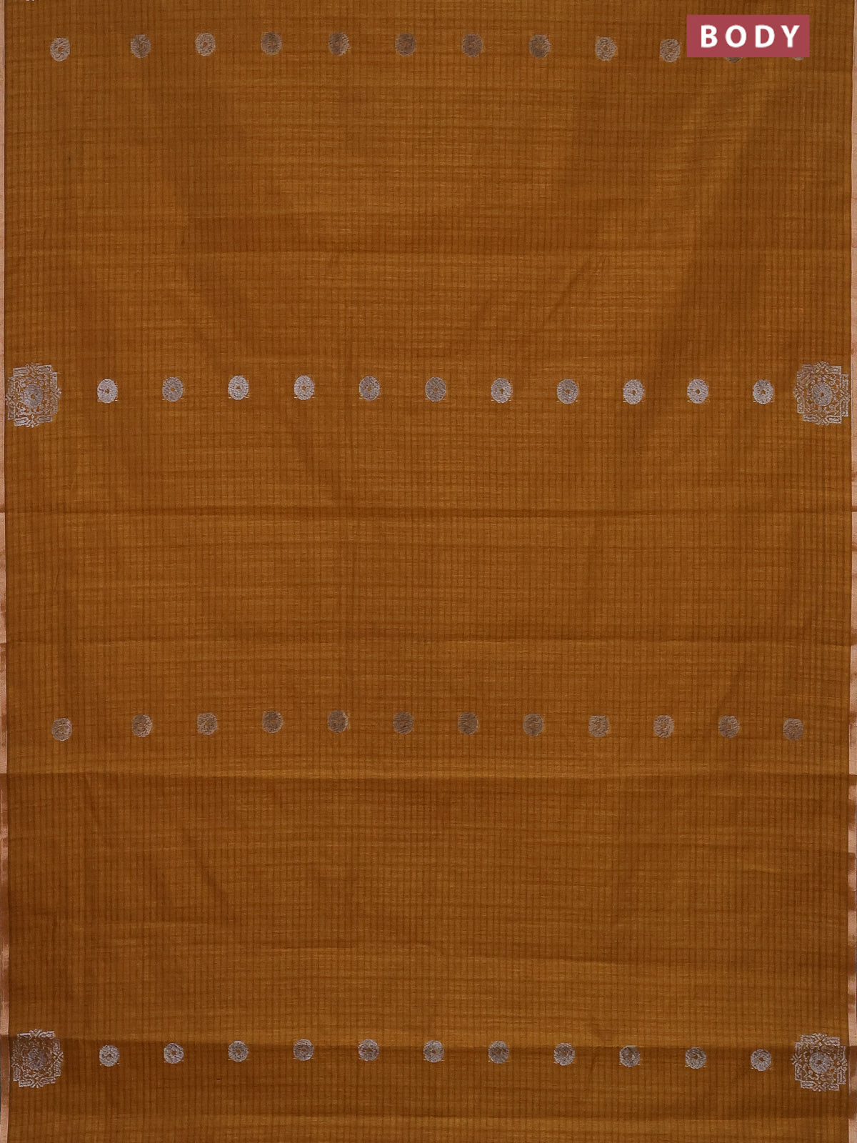 Banarasi semi matka saree dark mustard with silver & gold zari woven buttas and zari woven piping border