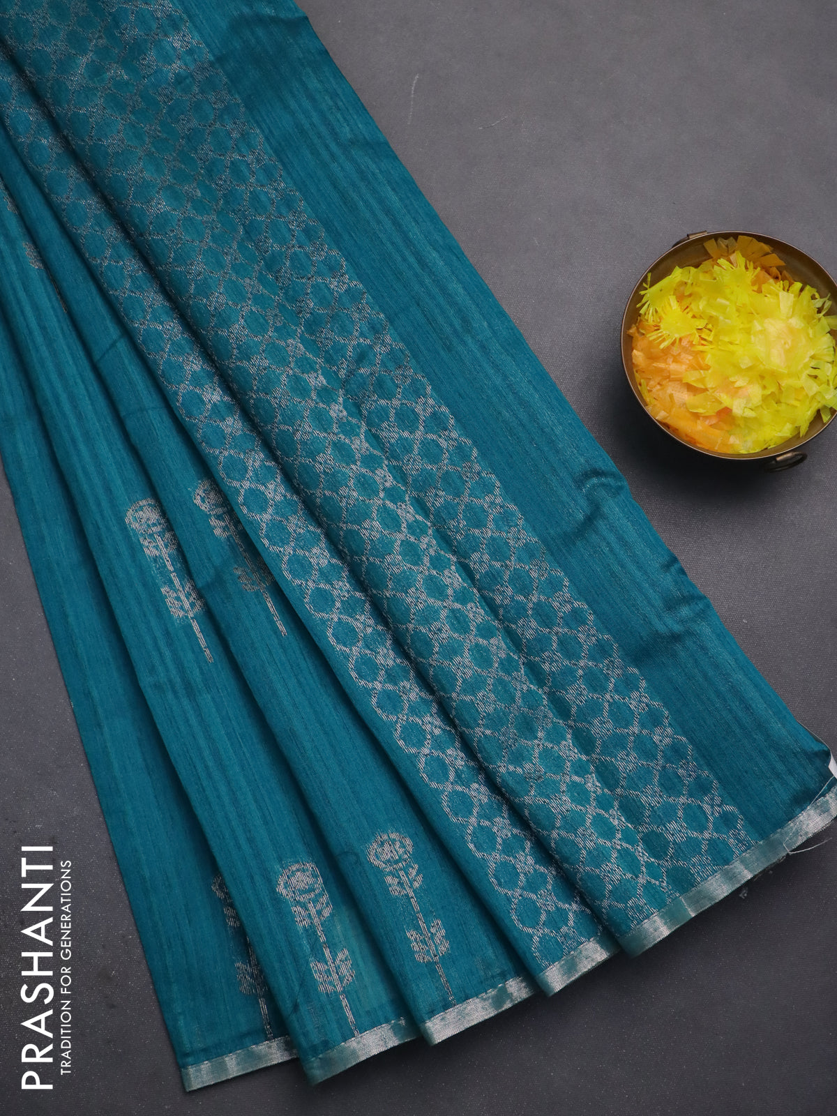 Banarasi semi matka saree teal blue shade with woven buttas and zari woven piping border