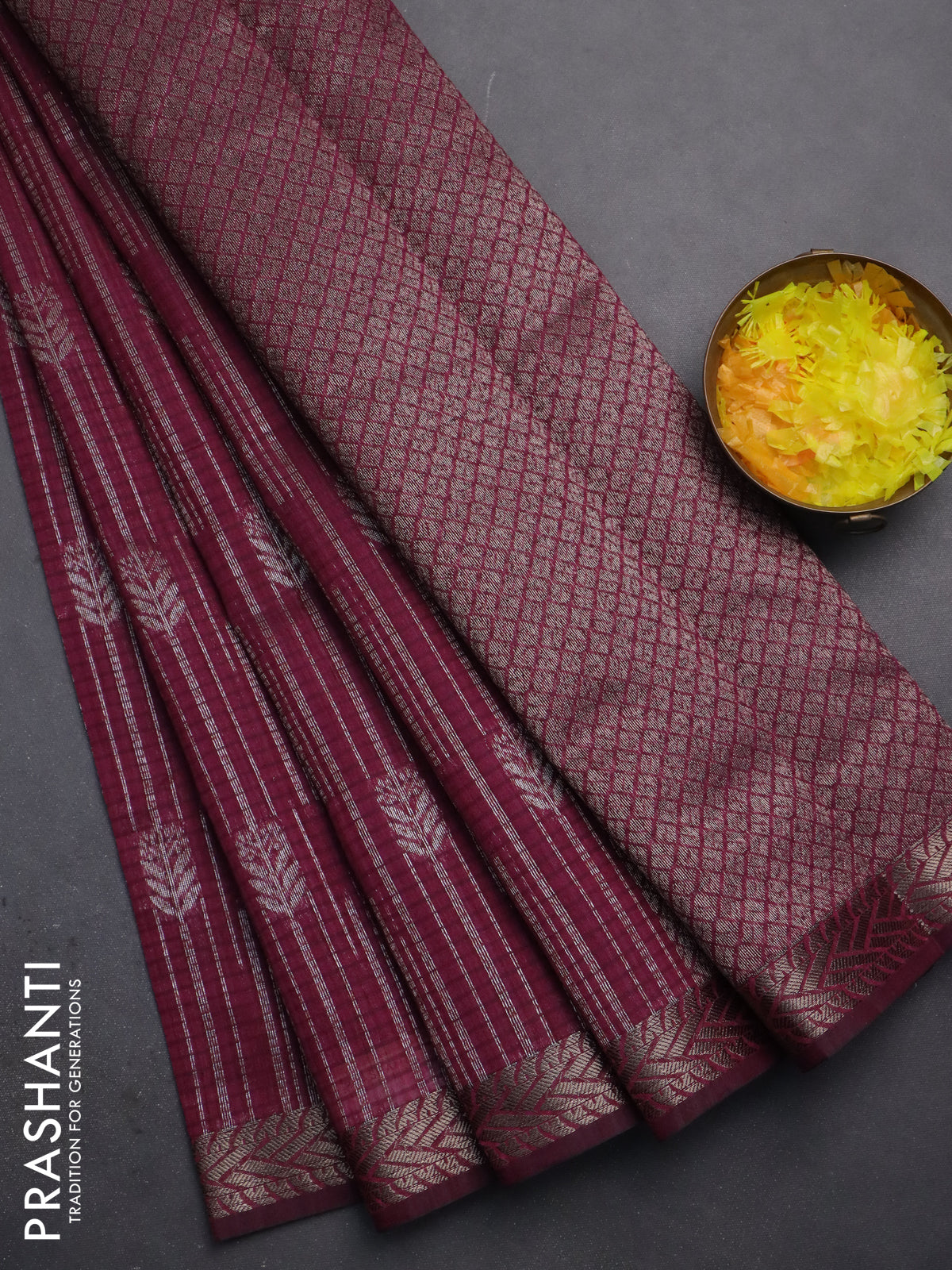Banarasi semi matka saree wine shade with allover thread & silver zari weaves and woven border