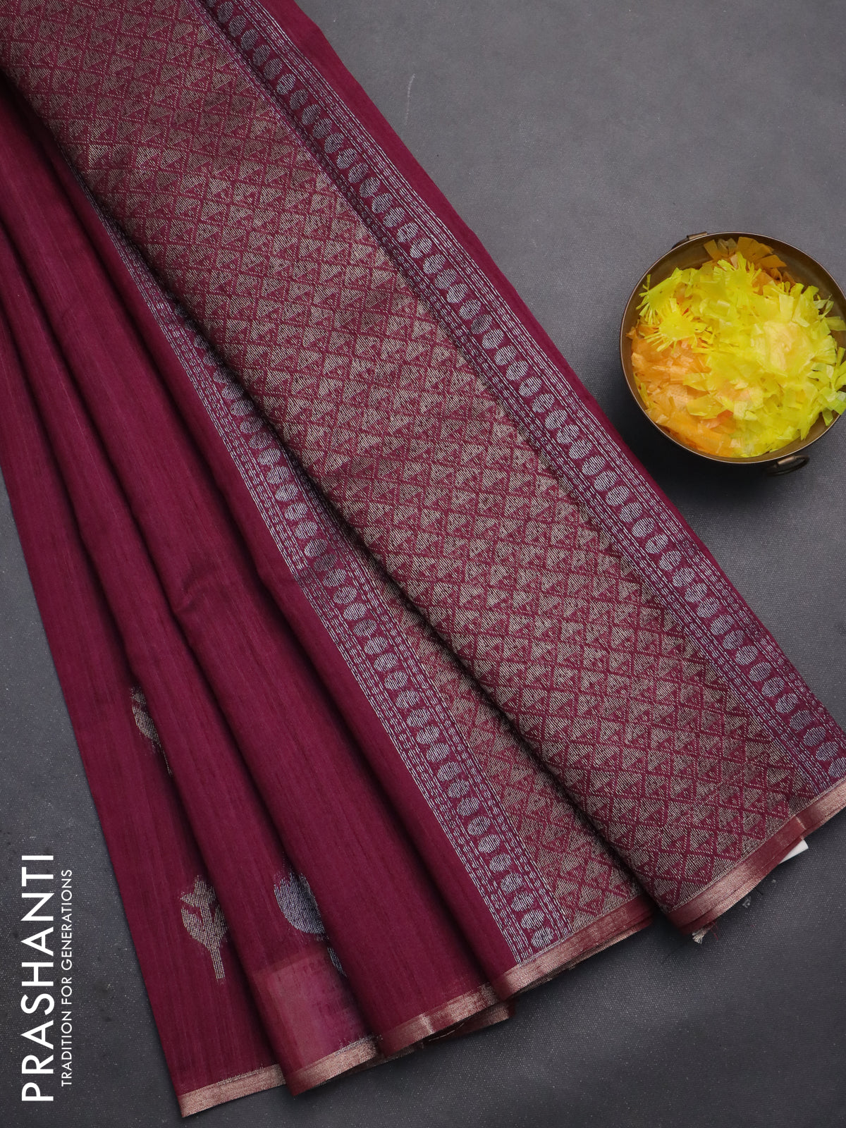 Banarasi semi matka saree wine shade with thread & silver zari woven buttas and zari woven piping border