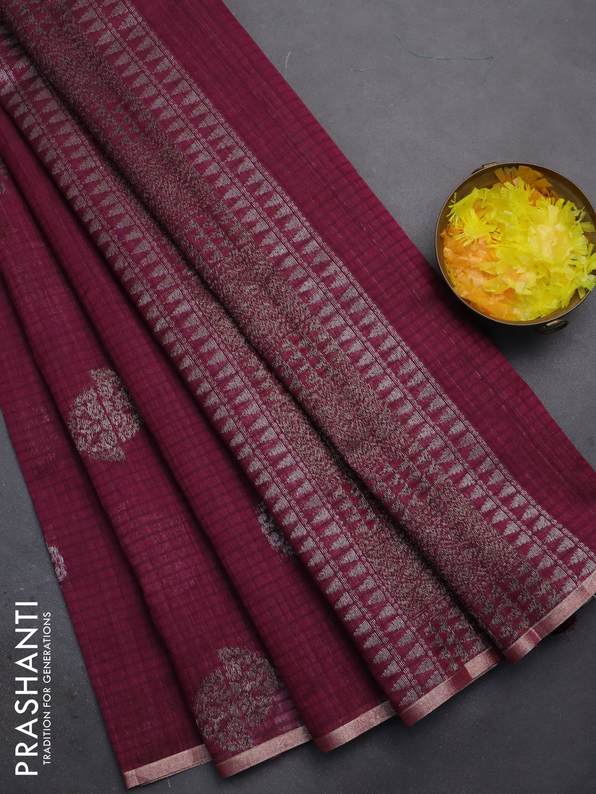 Banarasi semi matka saree wine shade with woven buttas and zari woven piping border