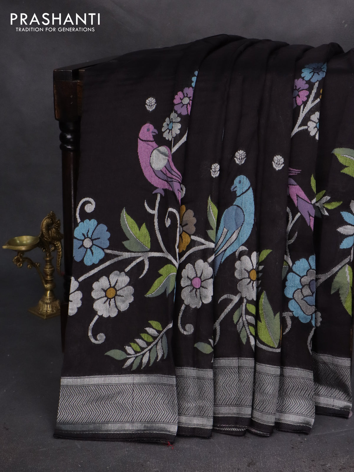 Banarasi semi raw silk saree black with allover jamdhani weaves and silver zari woven border