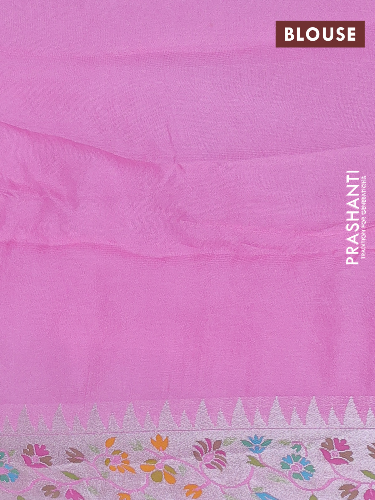 Banarasi semi raw silk saree light pink with allover silver zari woven floral weaves and floral design paithani border