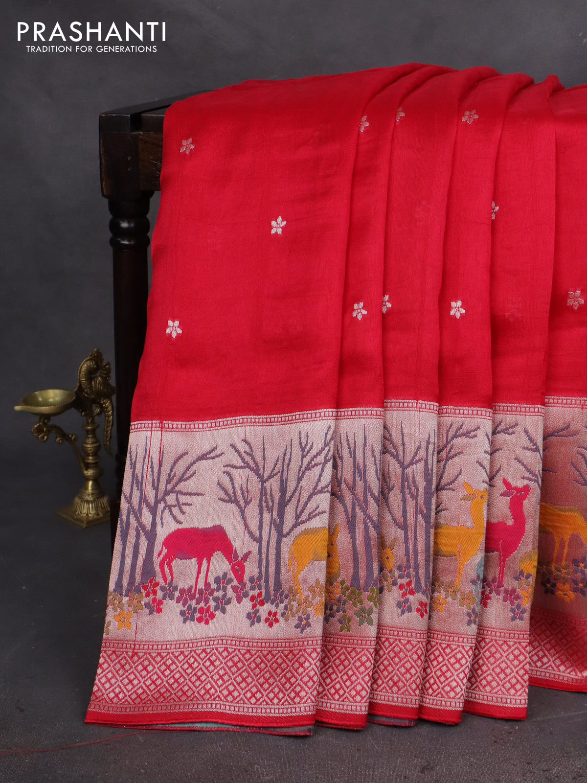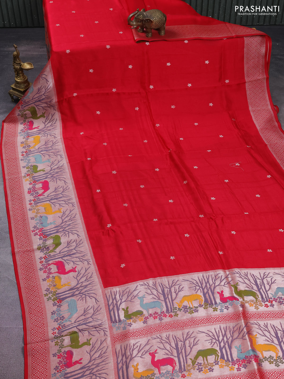 Banarasi semi raw silk saree tomato pink with silver zari woven buttas and silver zari woven border