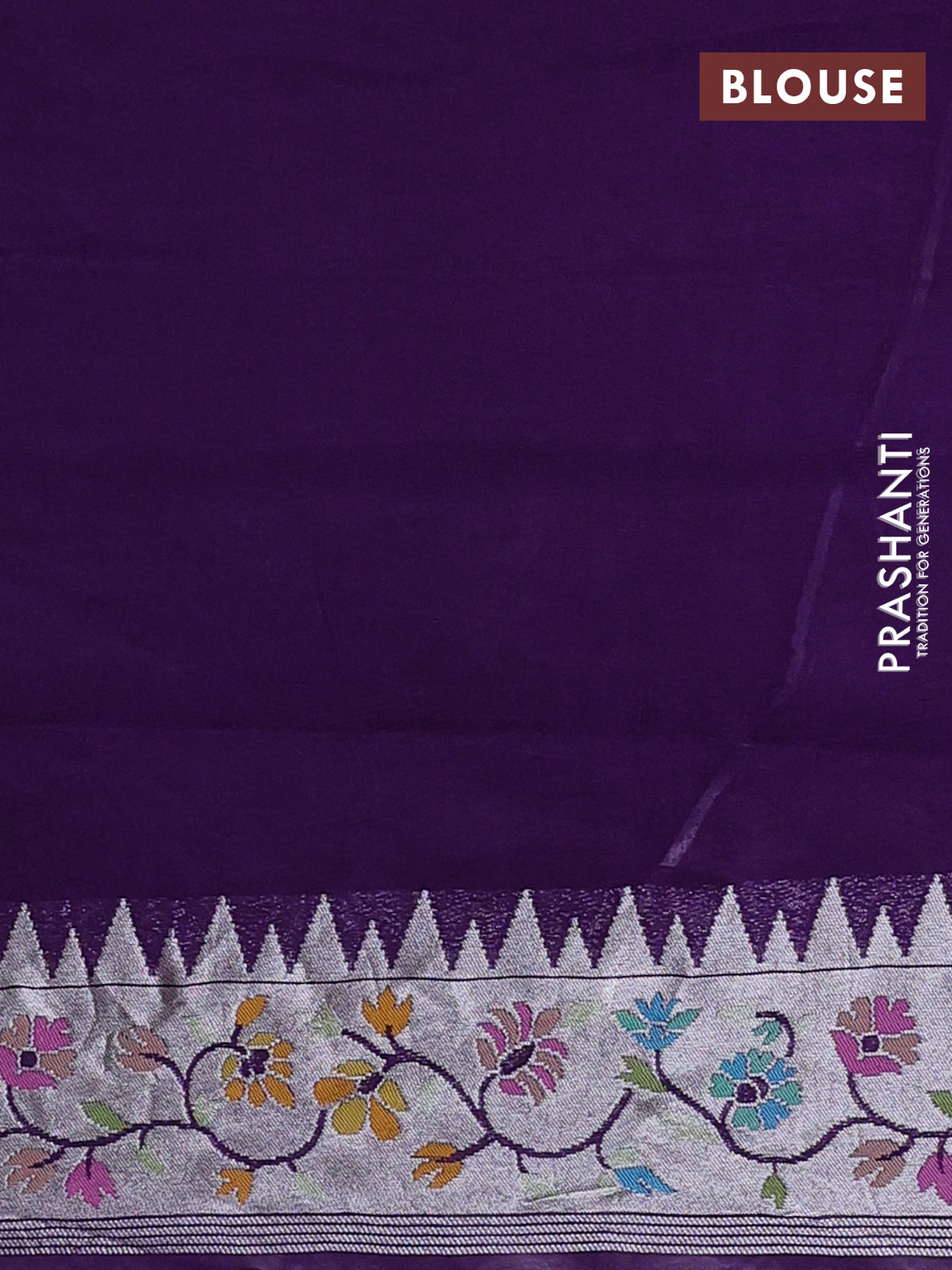 Banarasi semi raw silk saree violet with allover silver zari woven floral weaves and floral design paithani border