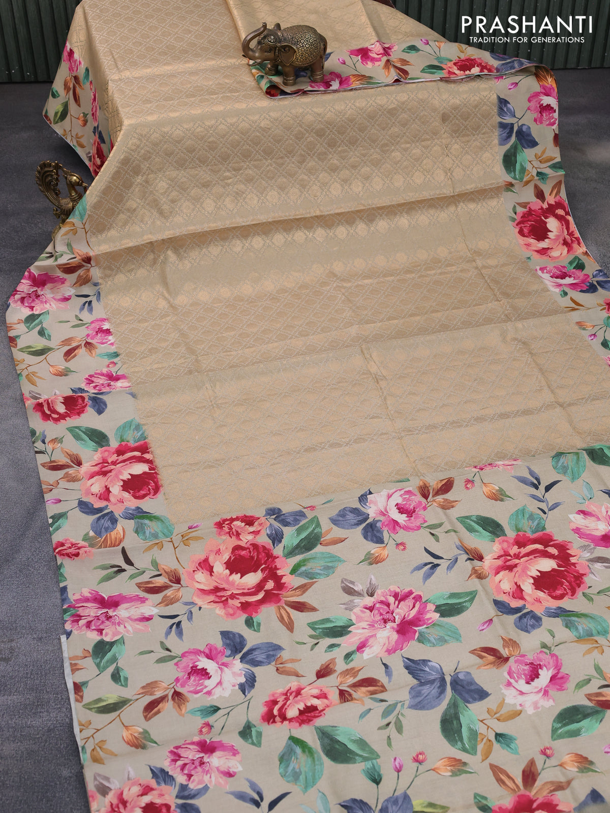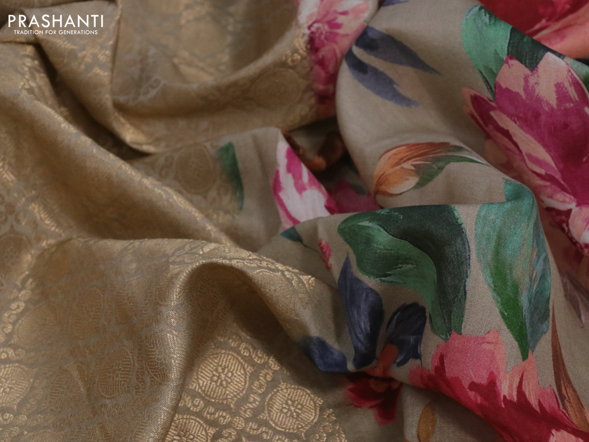 Banarasi silk saree beige with allover zari woven brocade weaves and floral digital printed border
