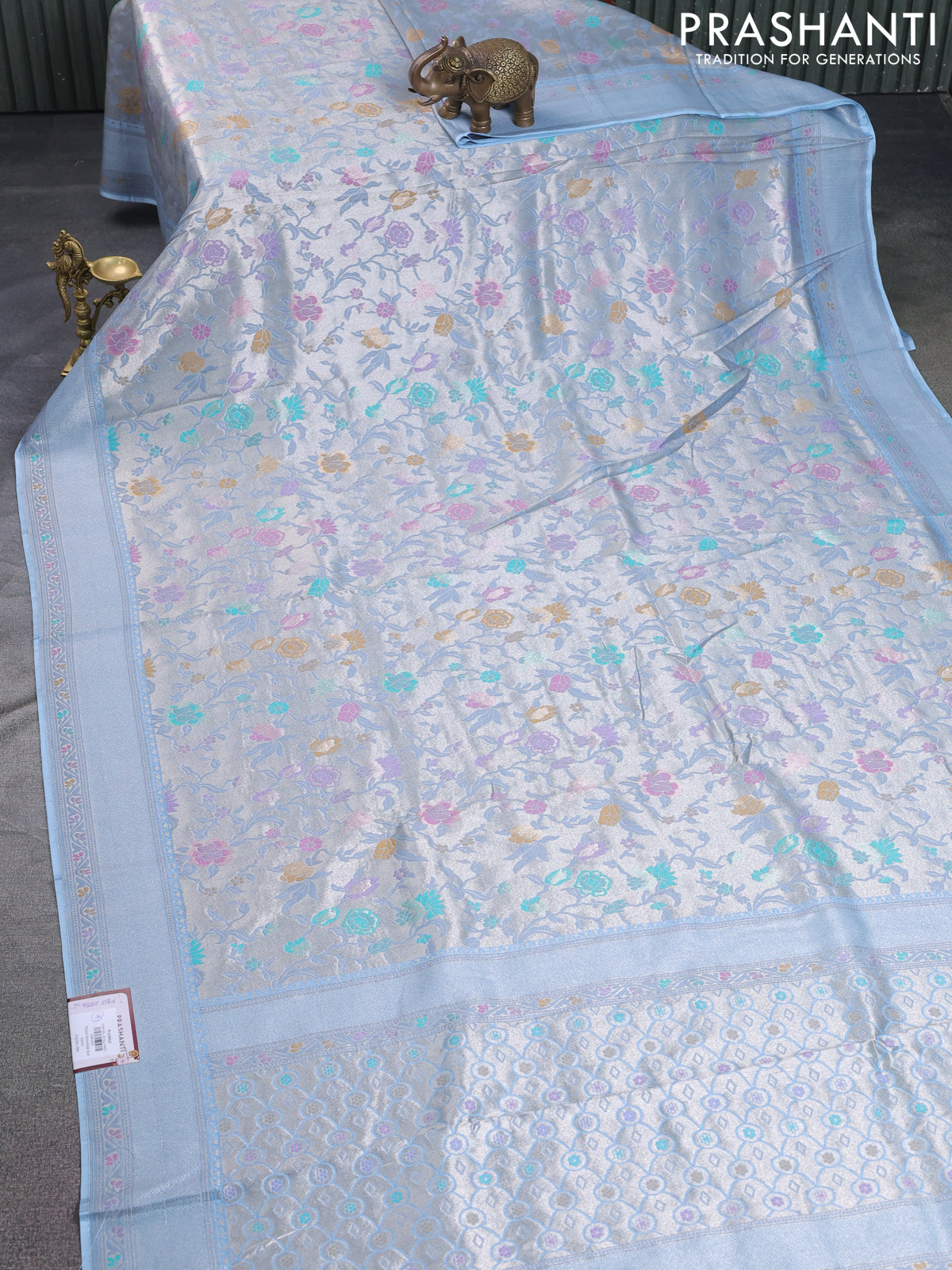 Banarasi tissue silk saree light blue with allover thread woven floral weaves and silver zari woven border