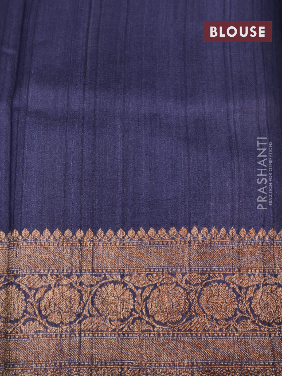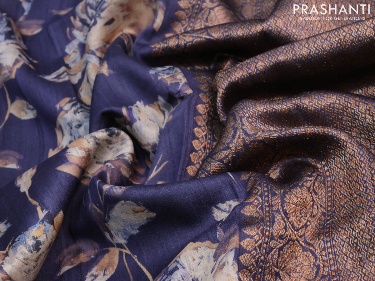 Banarasi tussar silk saree dark navy blue with allover floral digital prints and banarasi style border