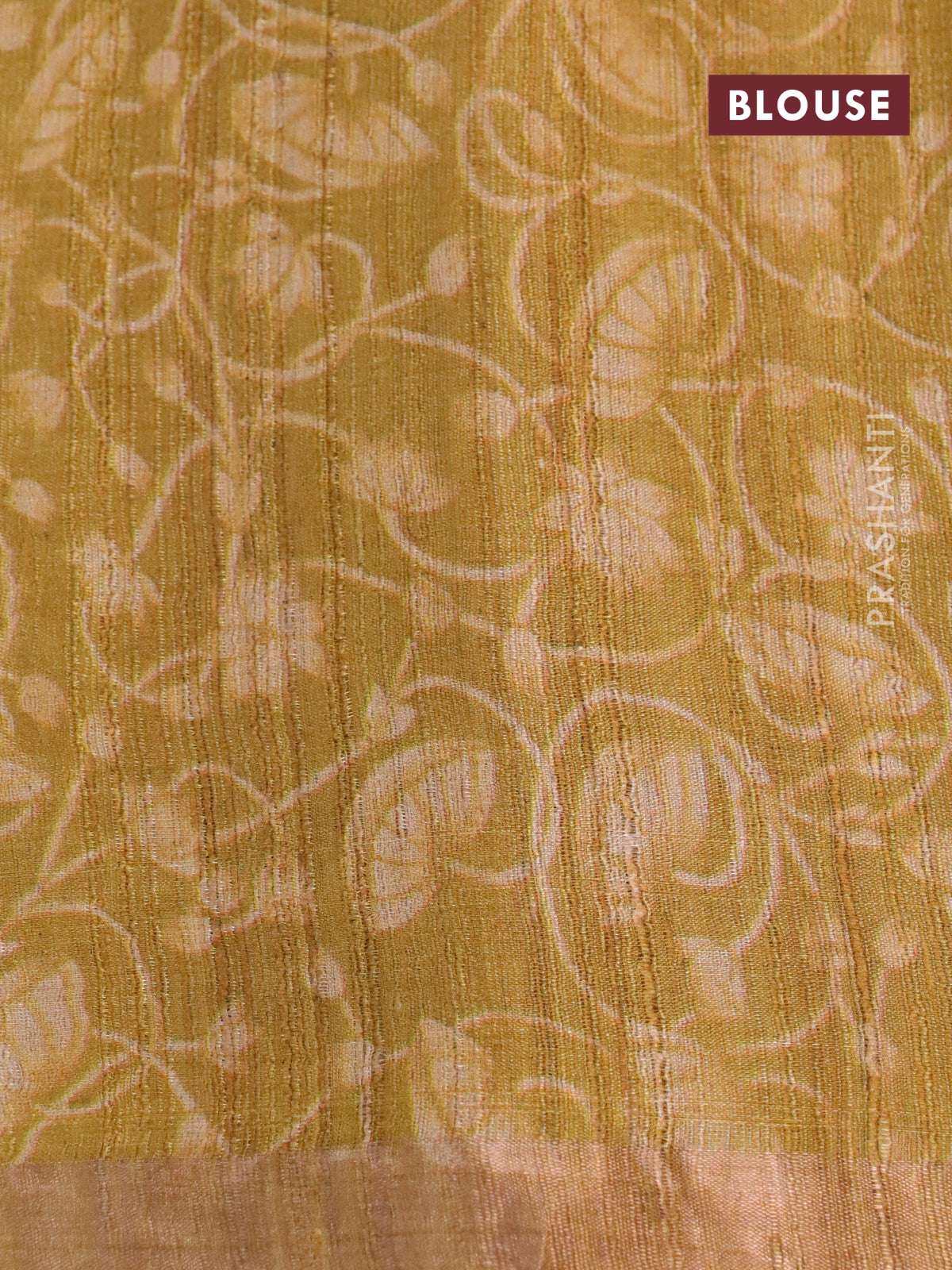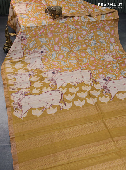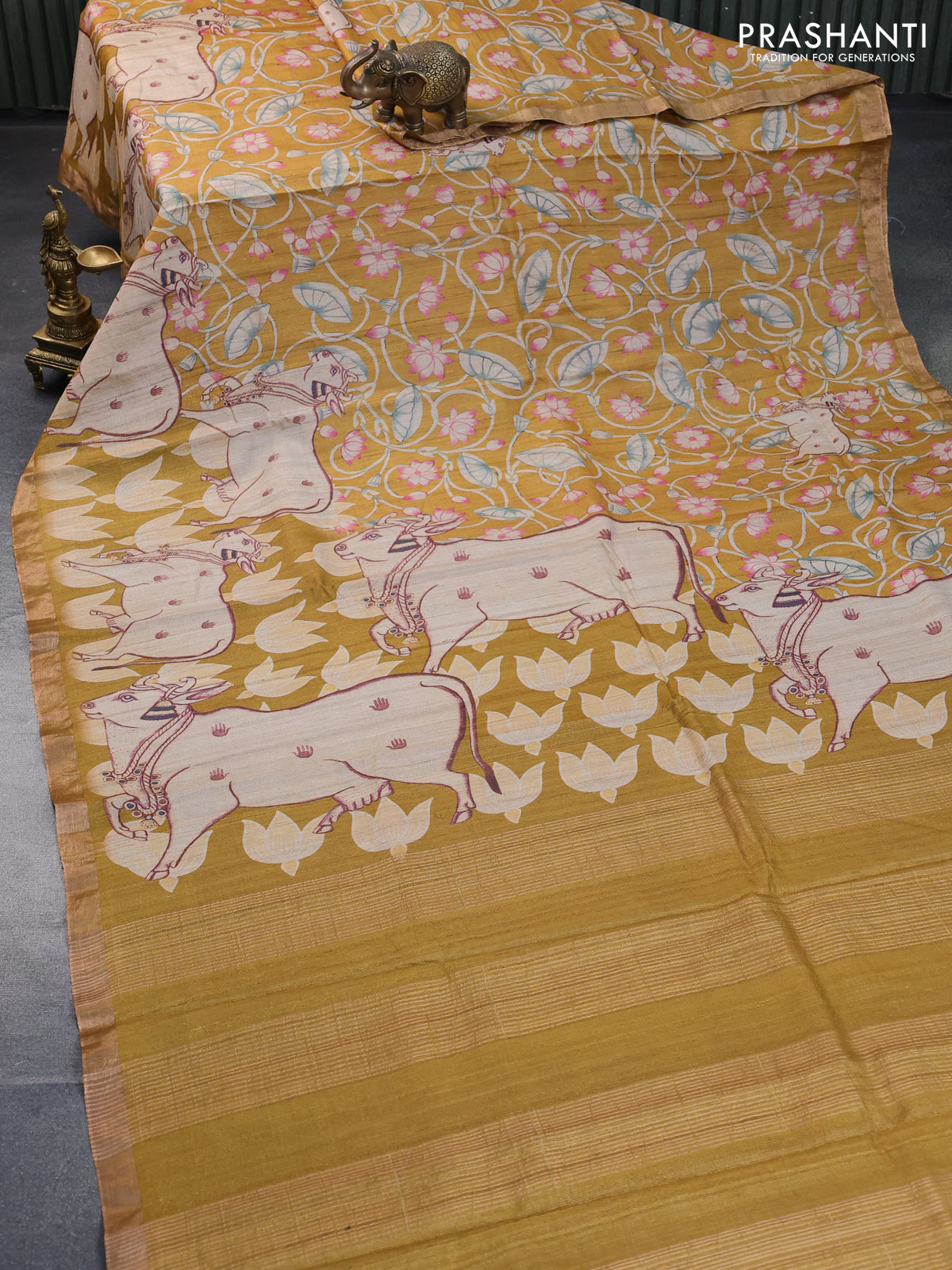 Banarasi tussar silk saree mustard yellow with allover pichwai digital prints and zari woven border