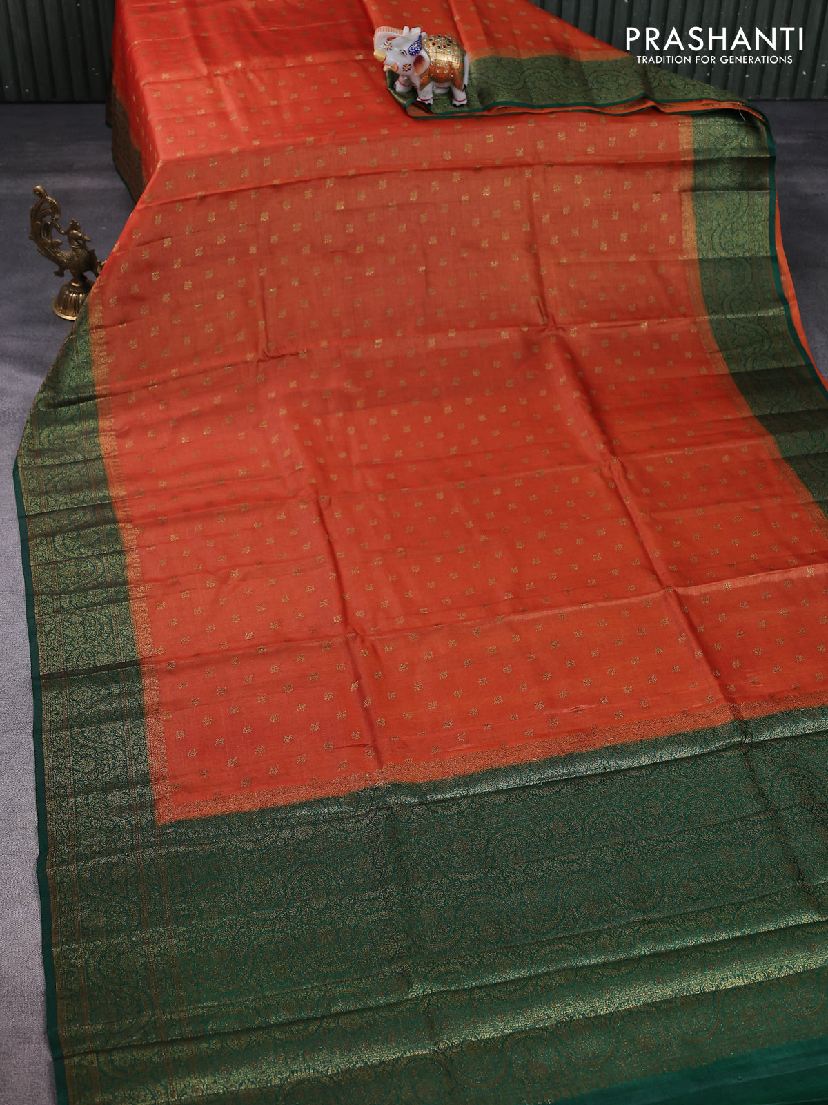 Banarasi tussar silk saree orange and green with thread & zari woven floral buttas and woven border