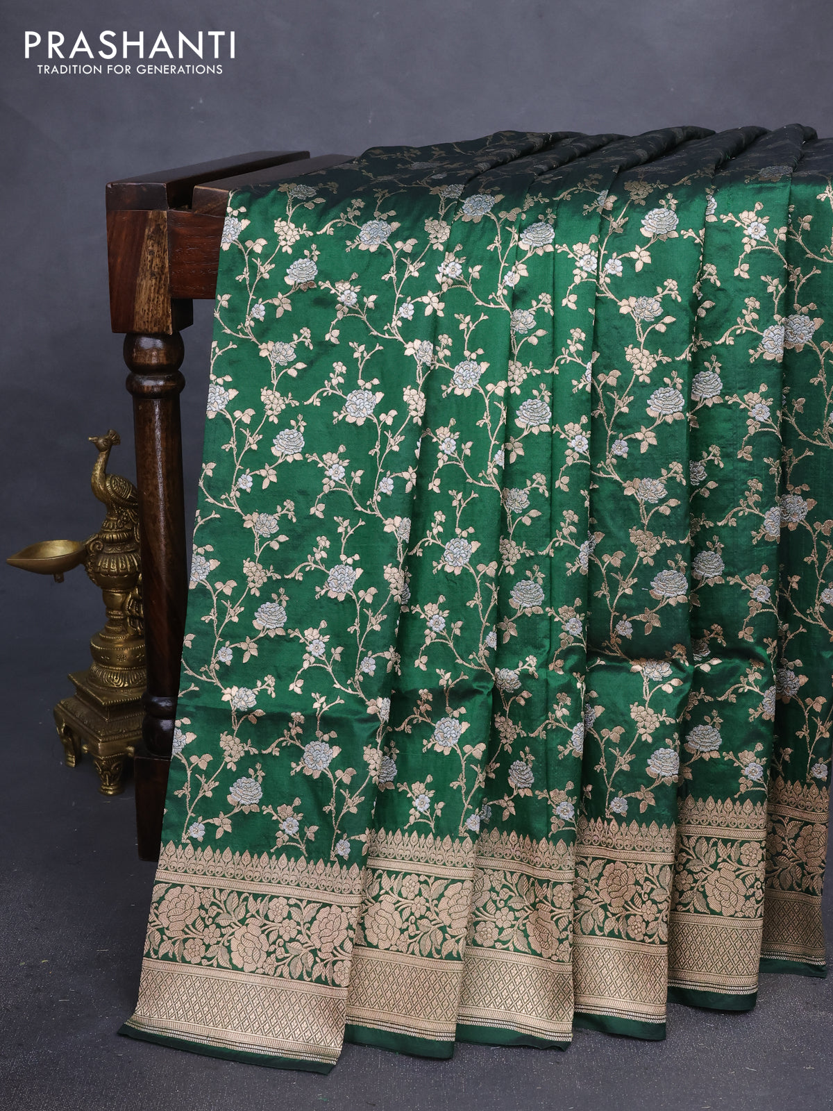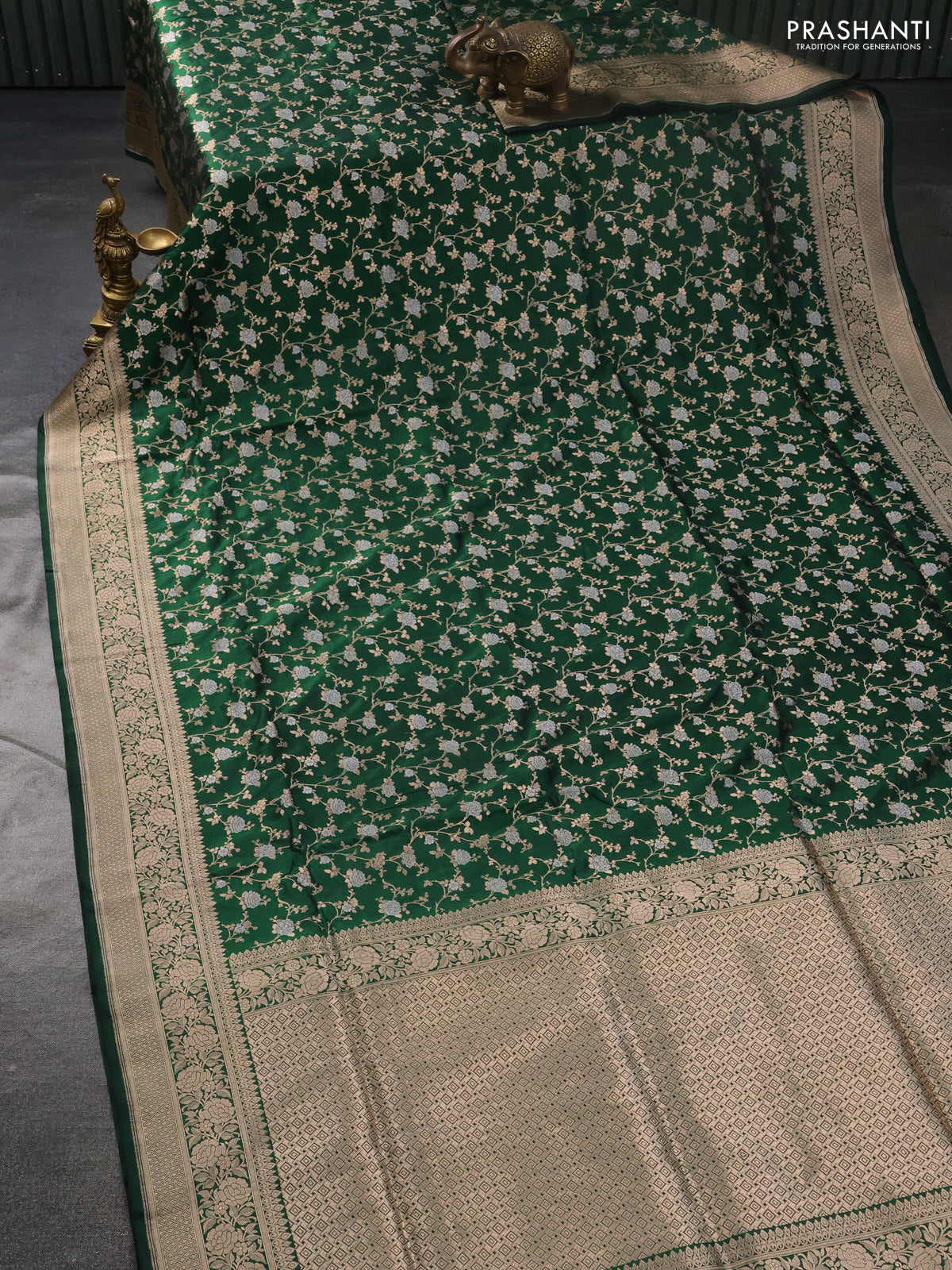 Banarasi uppada silk saree green with allover silver & gold zari woven floral weaves and zari woven border