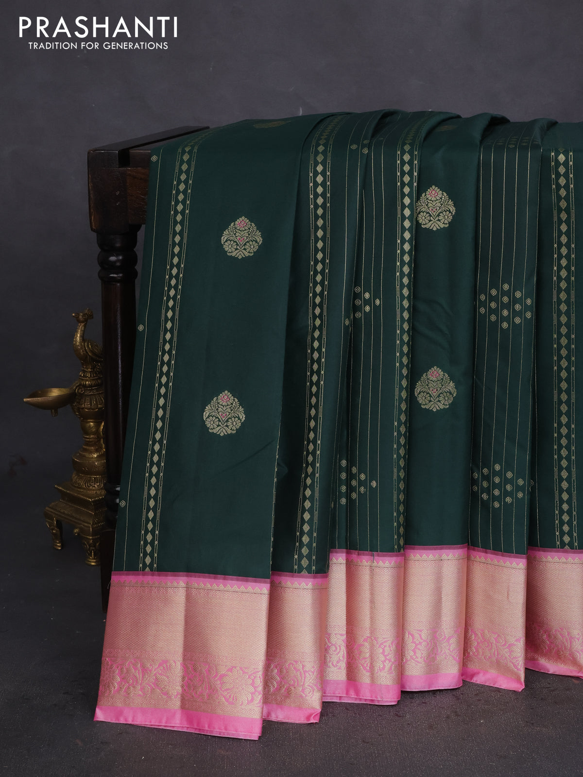 Bangalori silk saree bottle green and pink with allover zari weaves and zari woven border
