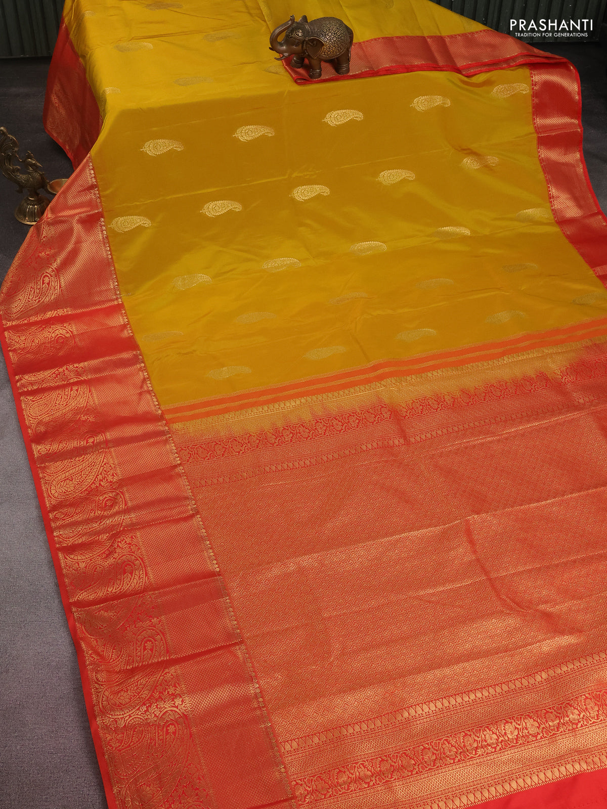 Bangalori silk saree mustard yellow and orange with paisley zari woven buttas and long zari woven border and Butta style