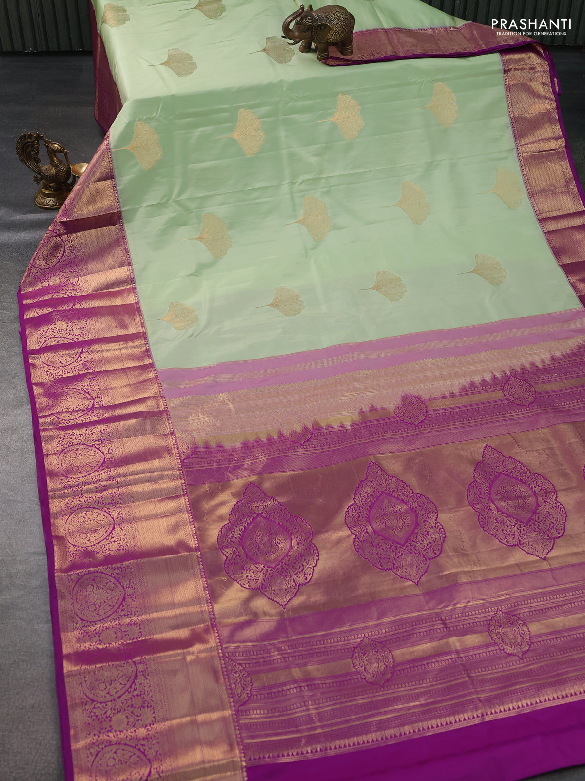 Bangalori silk saree pastel green and purple with zari woven buttas and long zari woven border and Butta style