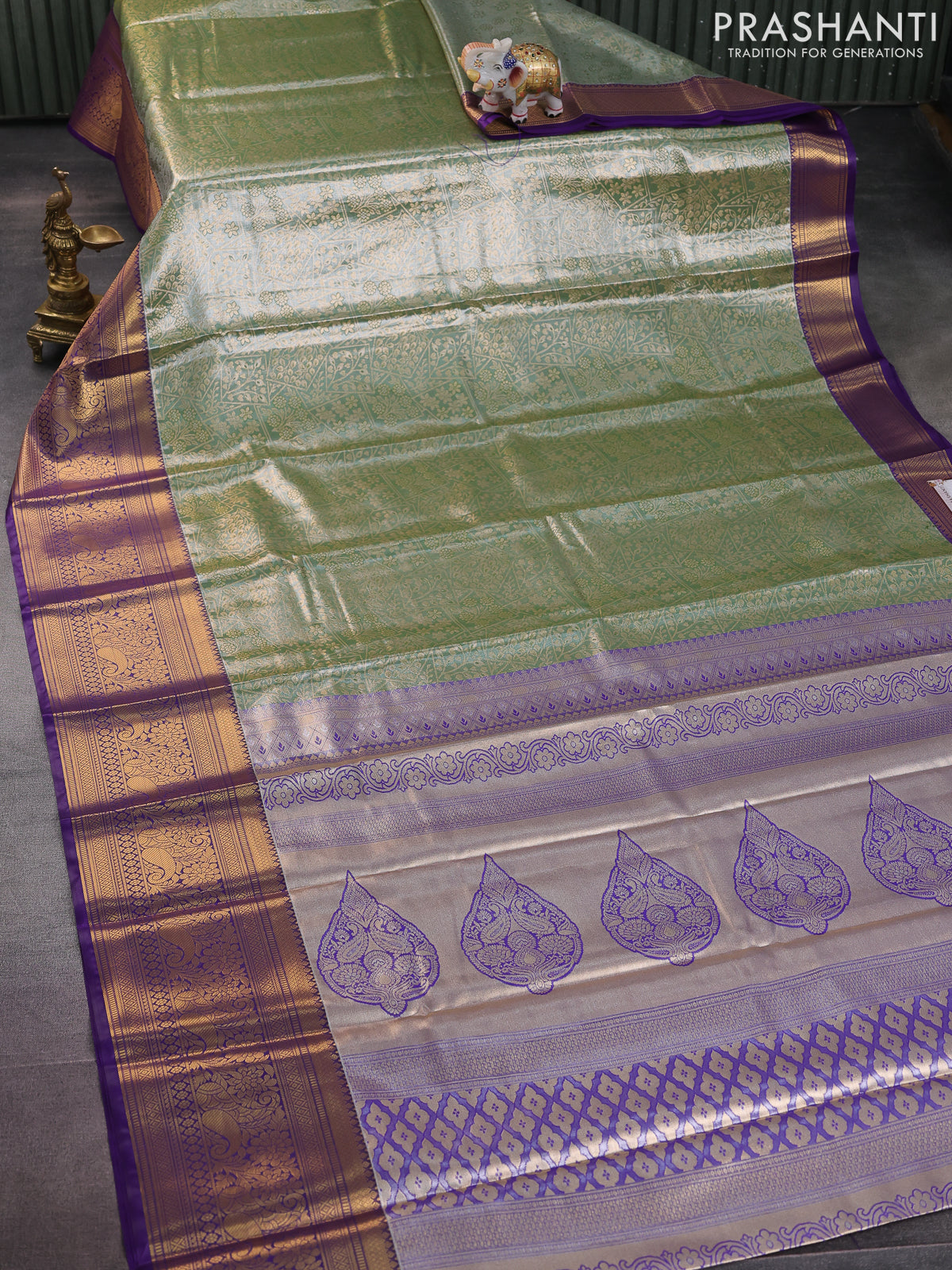 Bangalori tissue silk saree green shade and violet with allover zari woven brocade weaves and long zari woven border