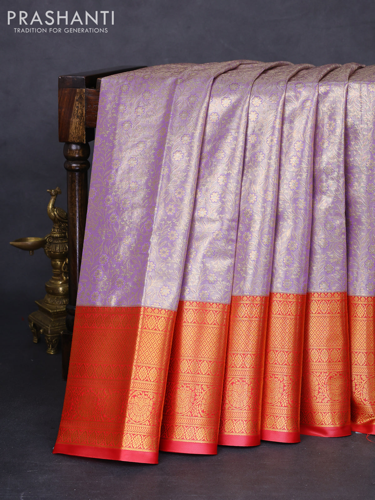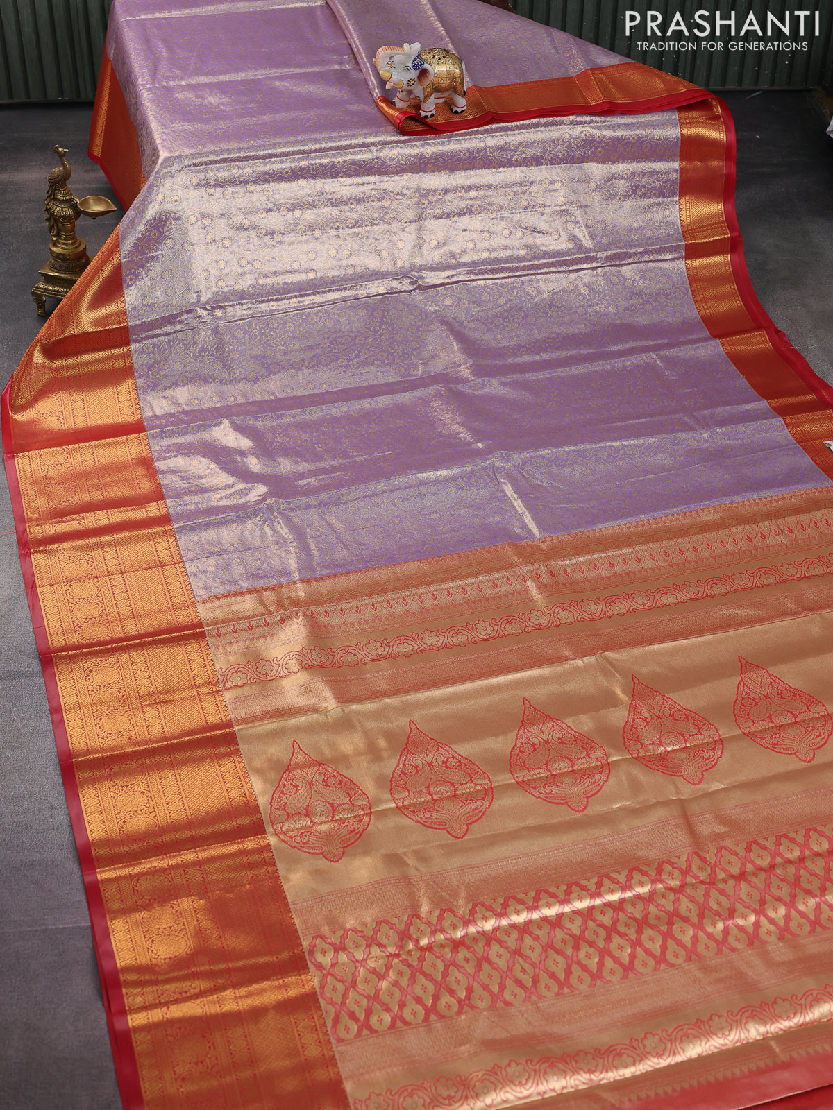 Bangalori tissue silk saree lavender and red with allover zari woven brocade weaves and long zari woven border