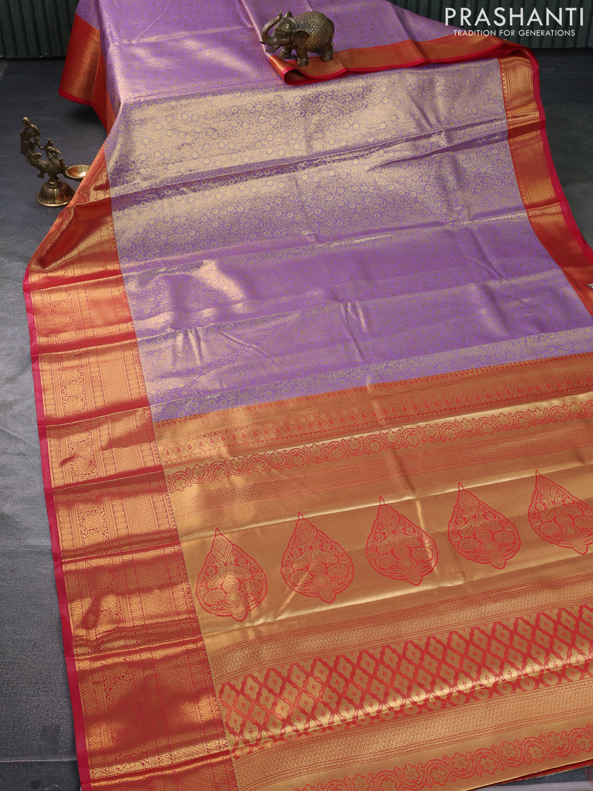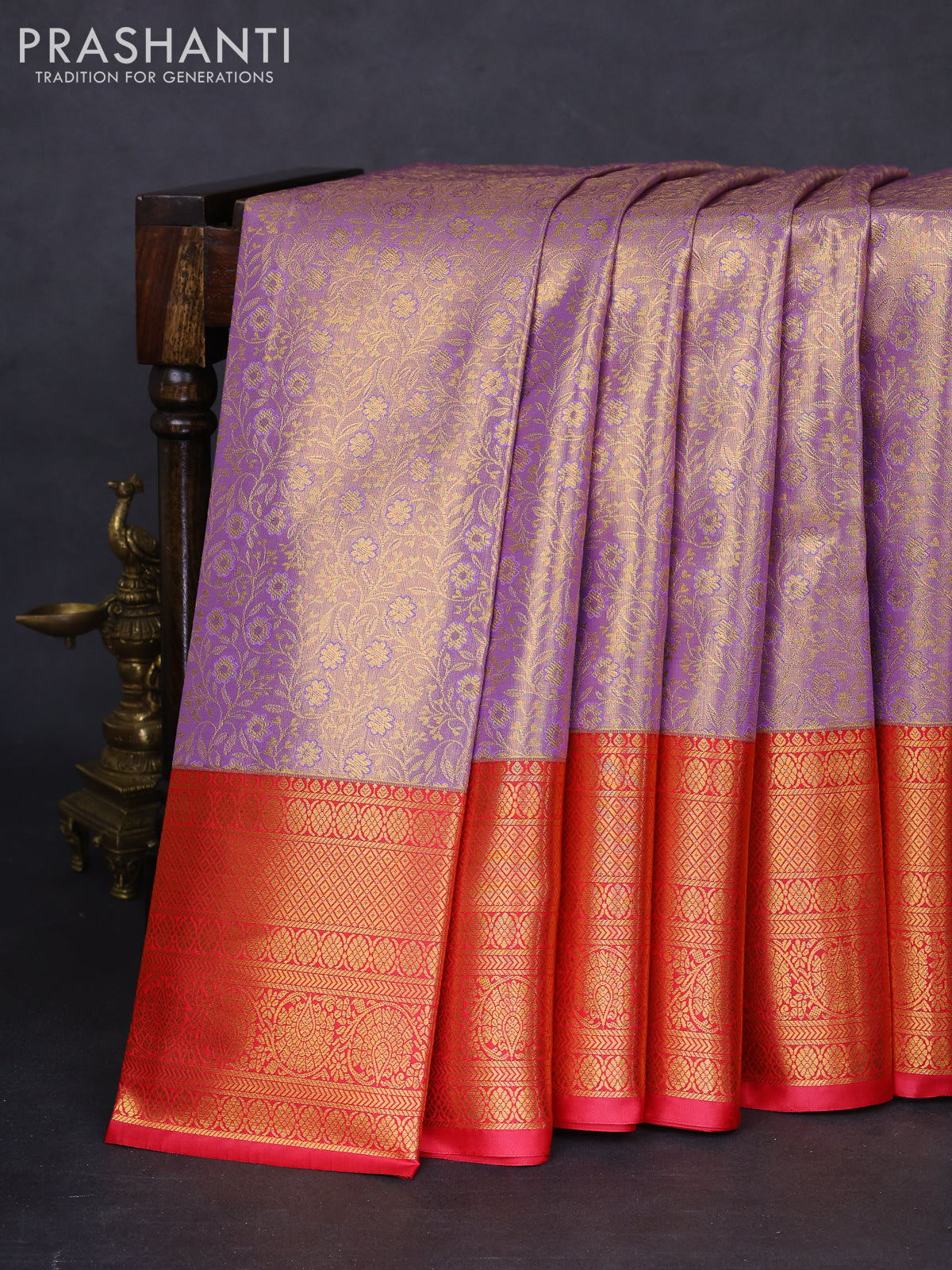 Bangalori tissue silk saree lavender and red with allover zari woven brocade weaves and long zari woven border