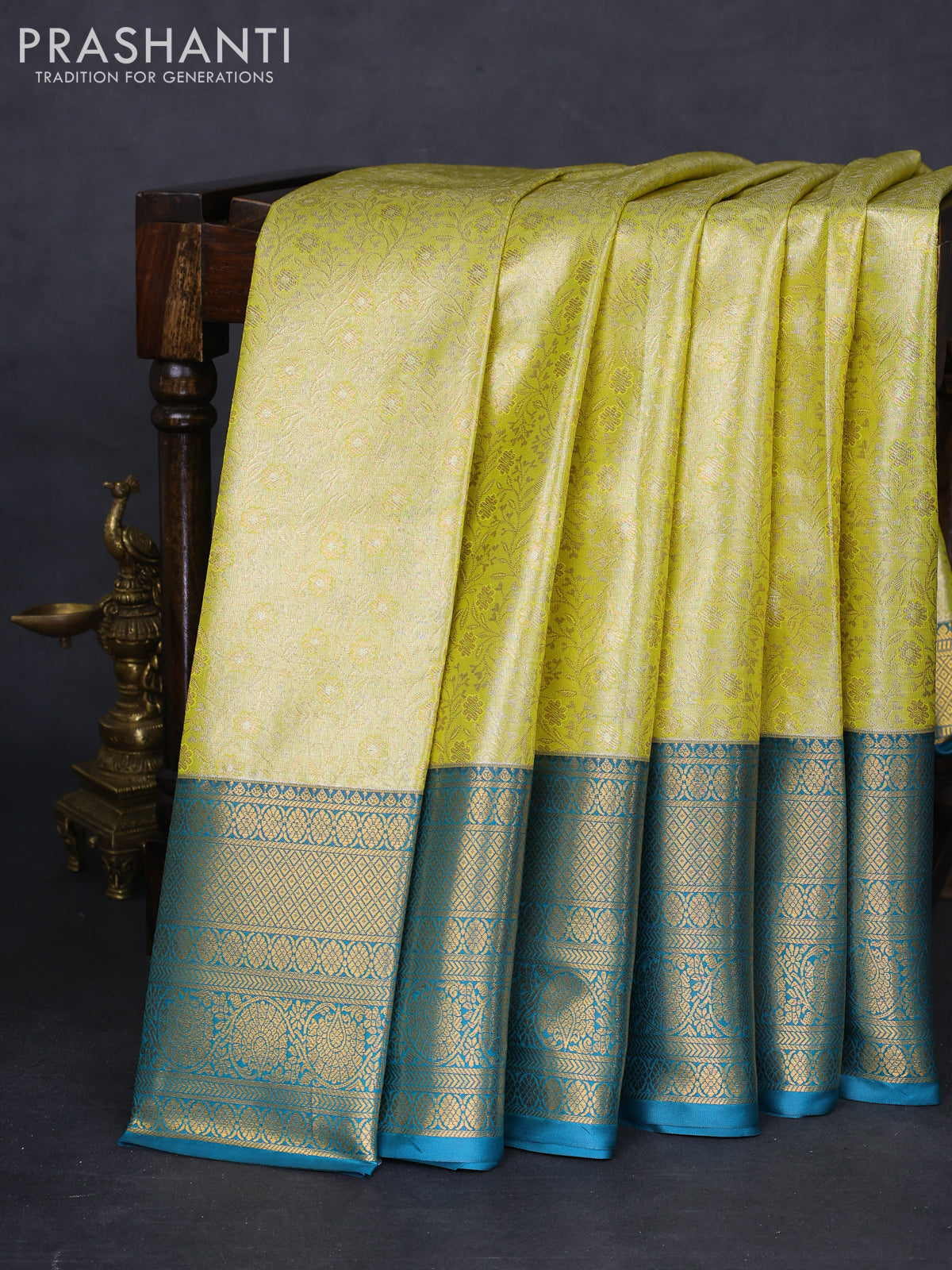 Bangalori tissue silk saree lime yellow and peacock blue with allover zari woven brocade weaves and long zari woven border