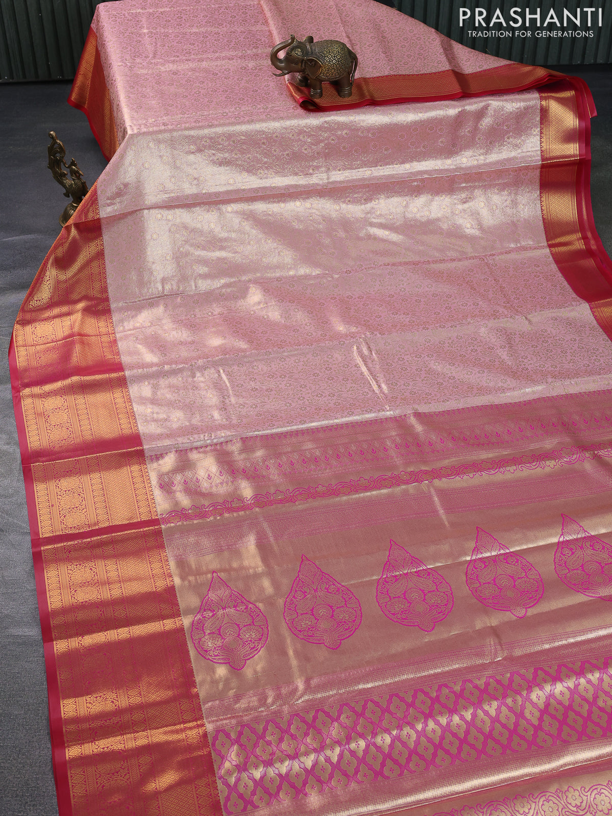 Bangalori tissue silk saree mild peach pink and pink with allover zari woven brocade weaves and long zari woven border