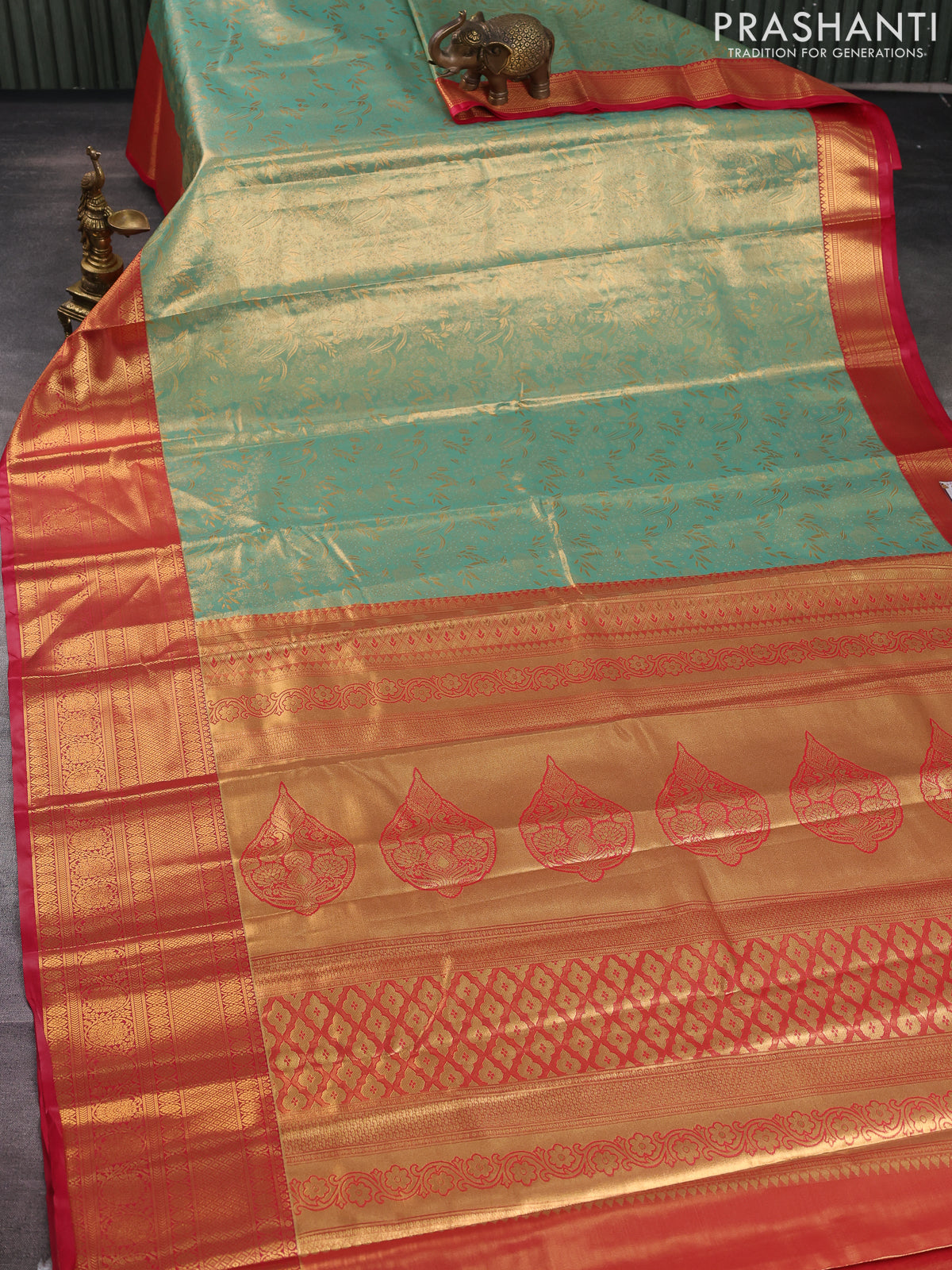 Bangalori tissue silk saree teal green shade and pink with allover zari woven brocade weaves and long zari woven border