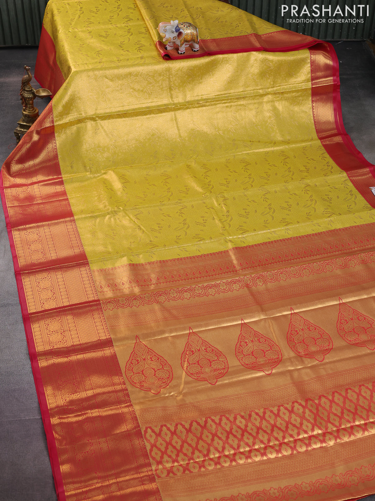 Bangalori tissue silk saree yellow and pink with allover zari woven brocade weaves and long zari woven border