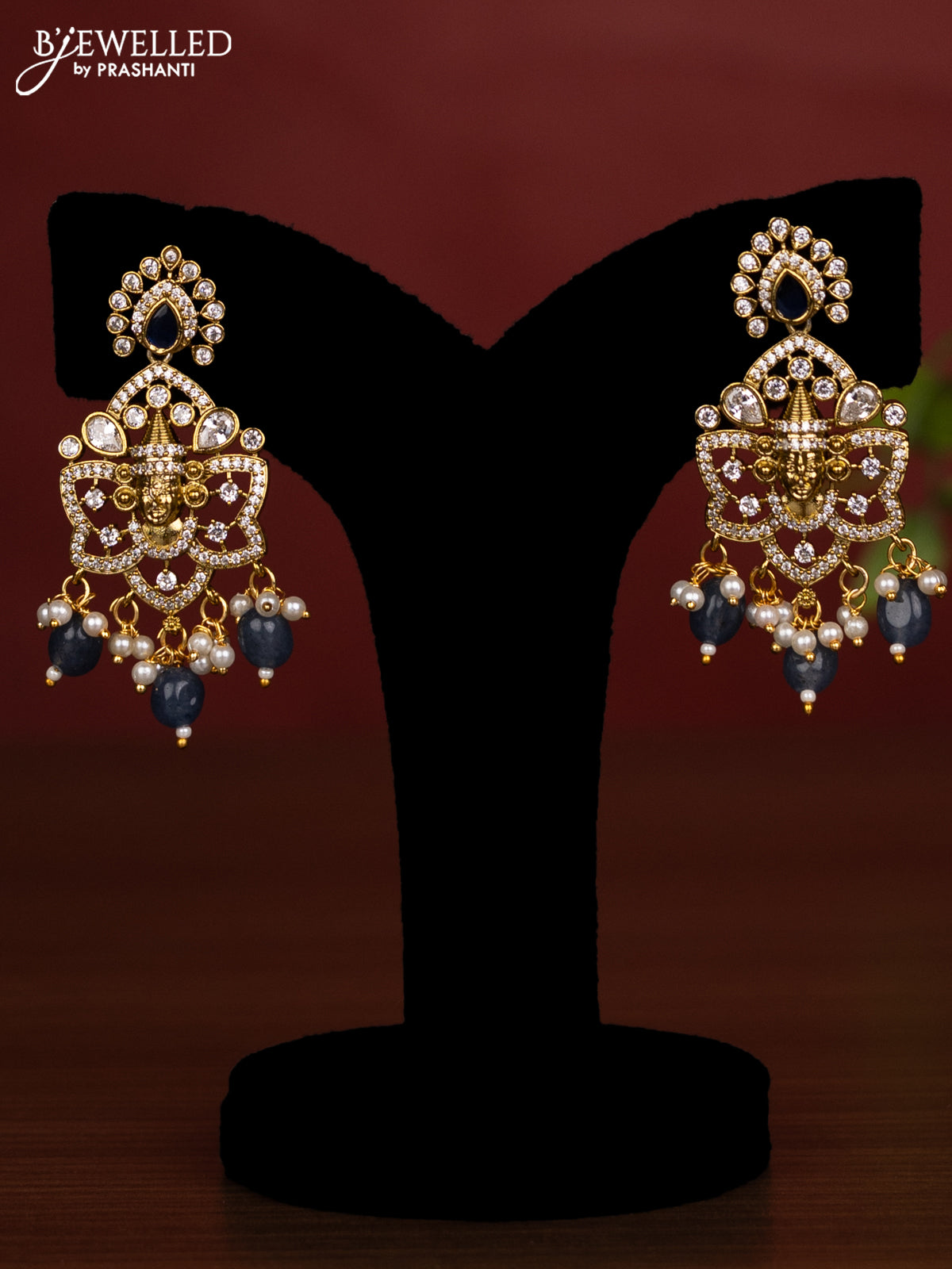 Beaded double layer blue necklace tiruapti balaji pendant with sapphire & cz stones and pearl & beads hanging in victorian finish