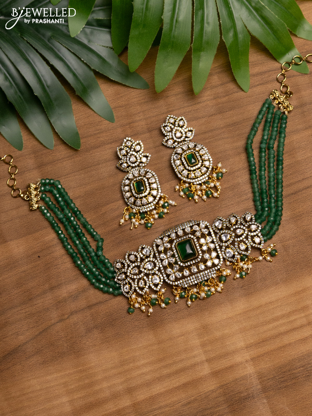 Beaded green choker with emerald & kundan stones and beads hanging in victorian finish