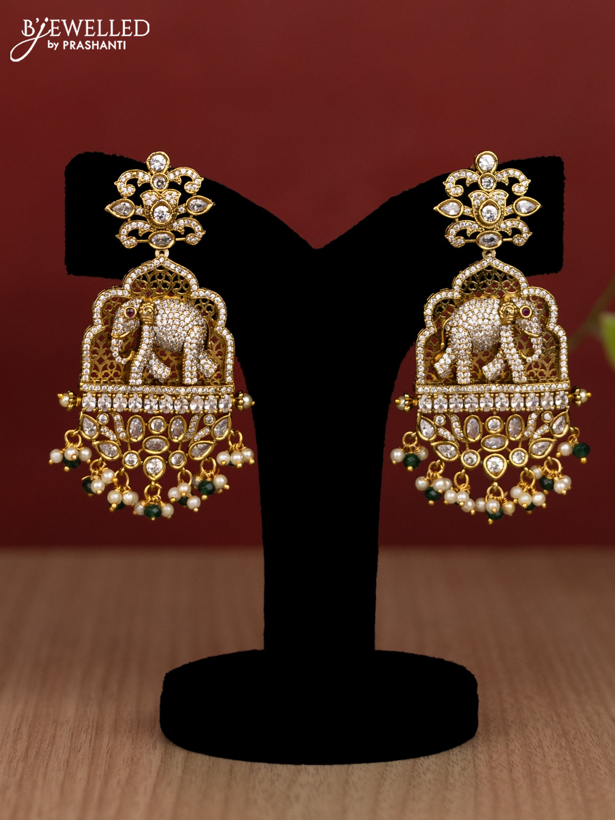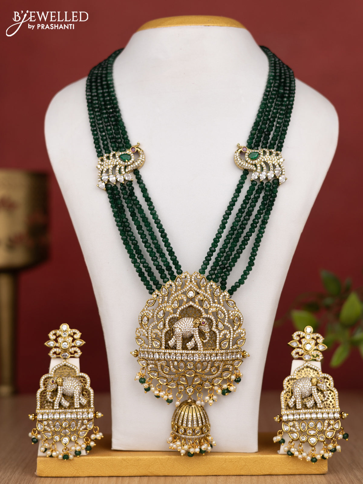 Beaded multilayer green haram elephant pendant with cz stones and pearl & beads hanging in victorian finish