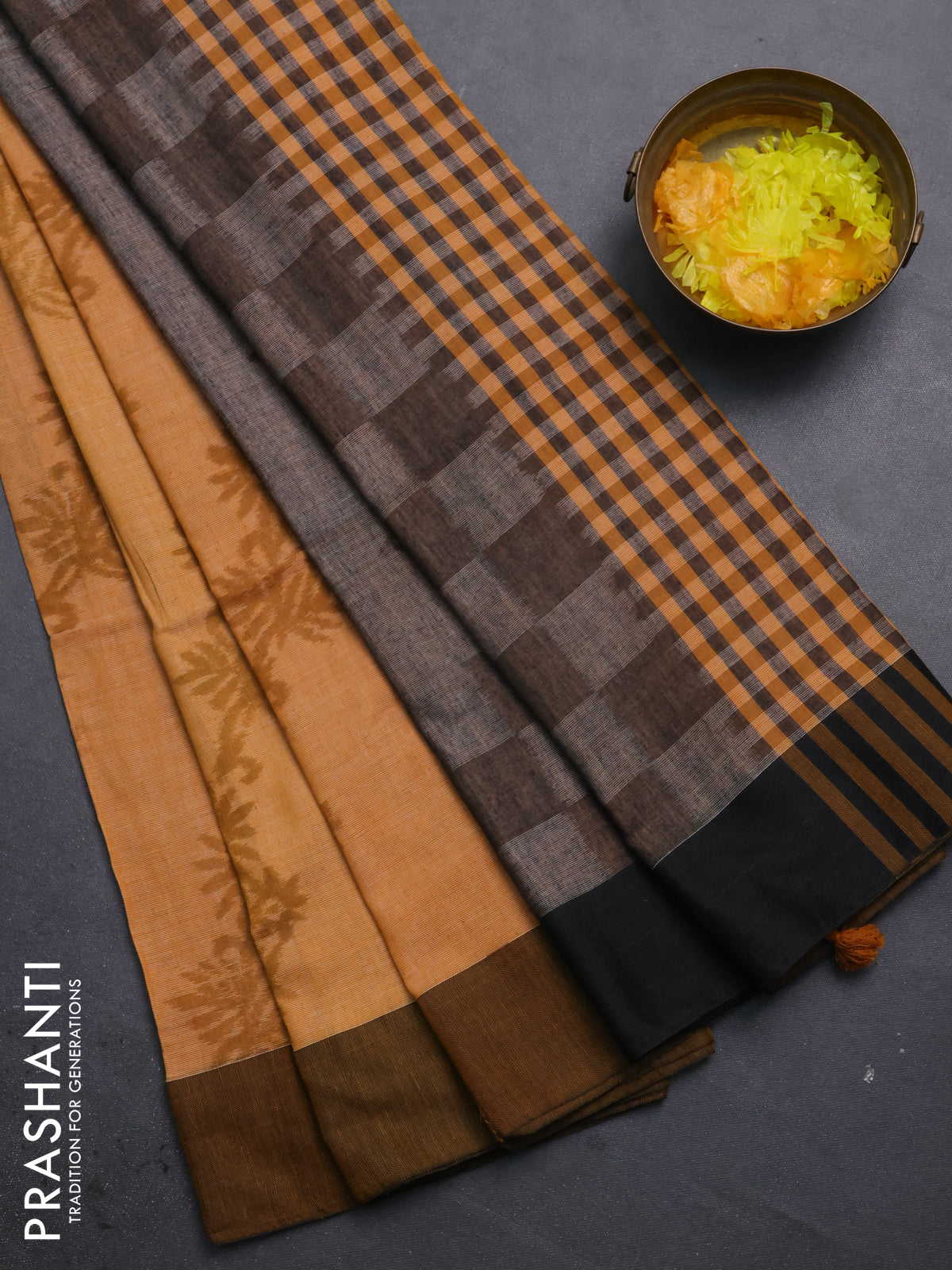 Bengal soft cotton saree dark mustard and grey with allover weaves and simple border