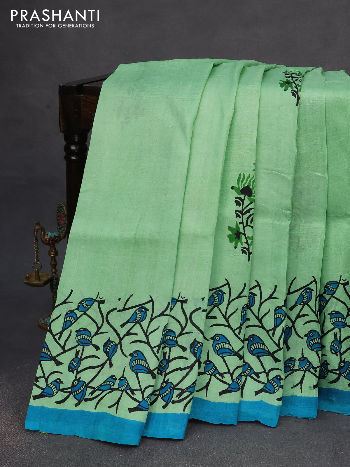 Bishnupuri silk saree pastel green and teal blue with butta prints and printed border