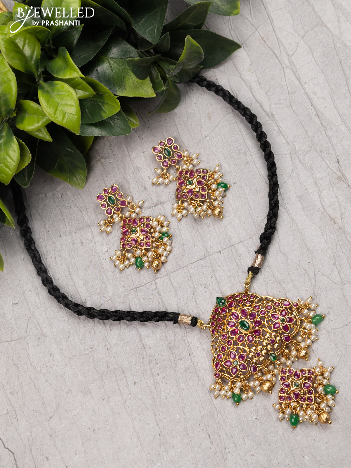 Black thread floral design necklace with kemp stone and pearl hangings