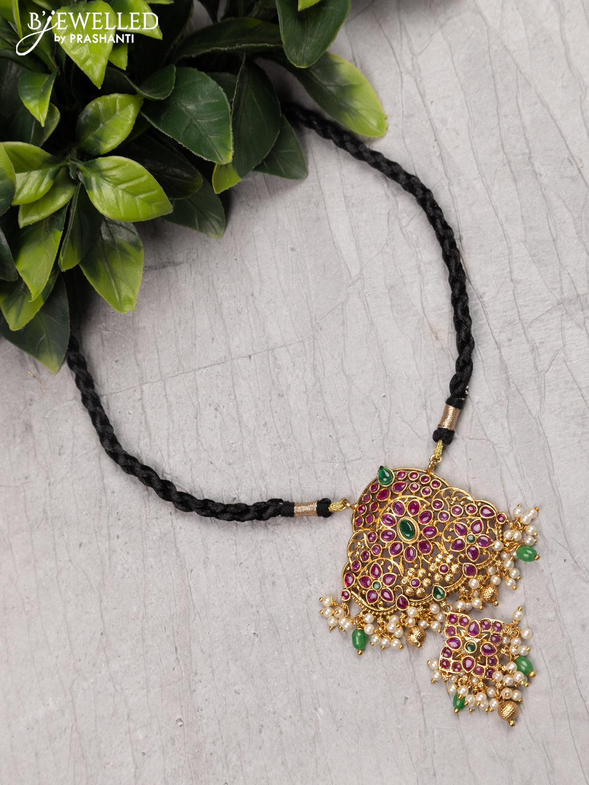 Black thread floral design necklace with kemp stone and pearl hangings without earrings