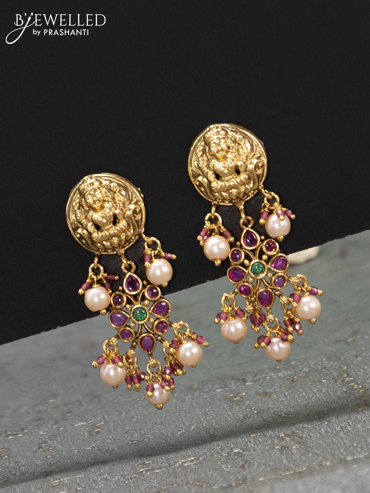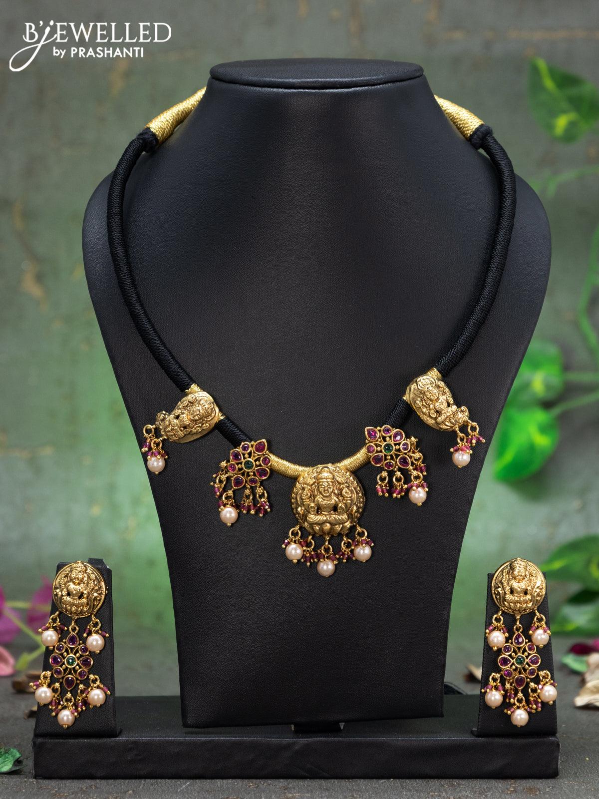 Black thread necklace kemp stones with lakshmi pendant and pearl hangings