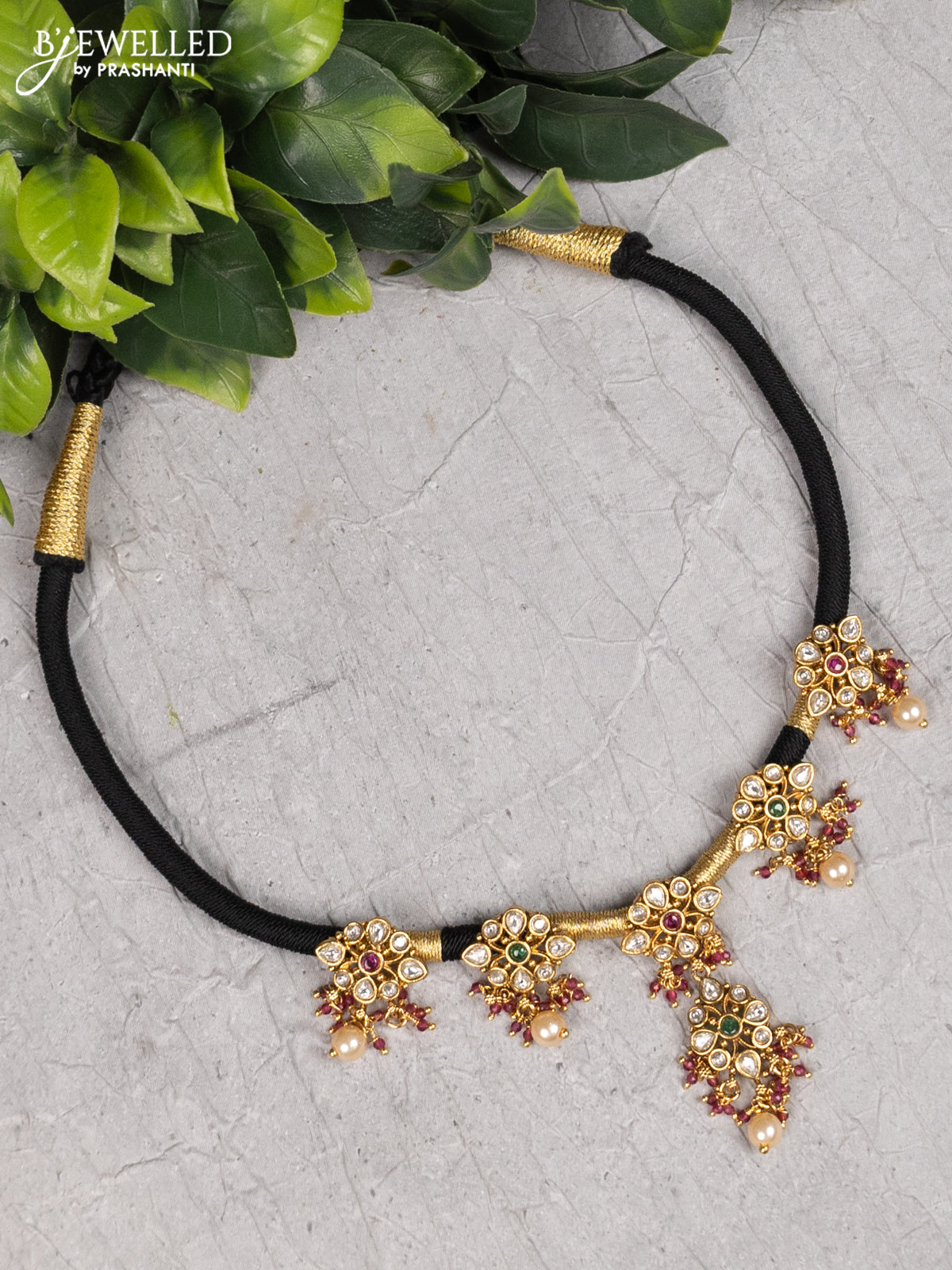 Black thread necklace with kemp & cz stones and crystal beads hanging without earrings