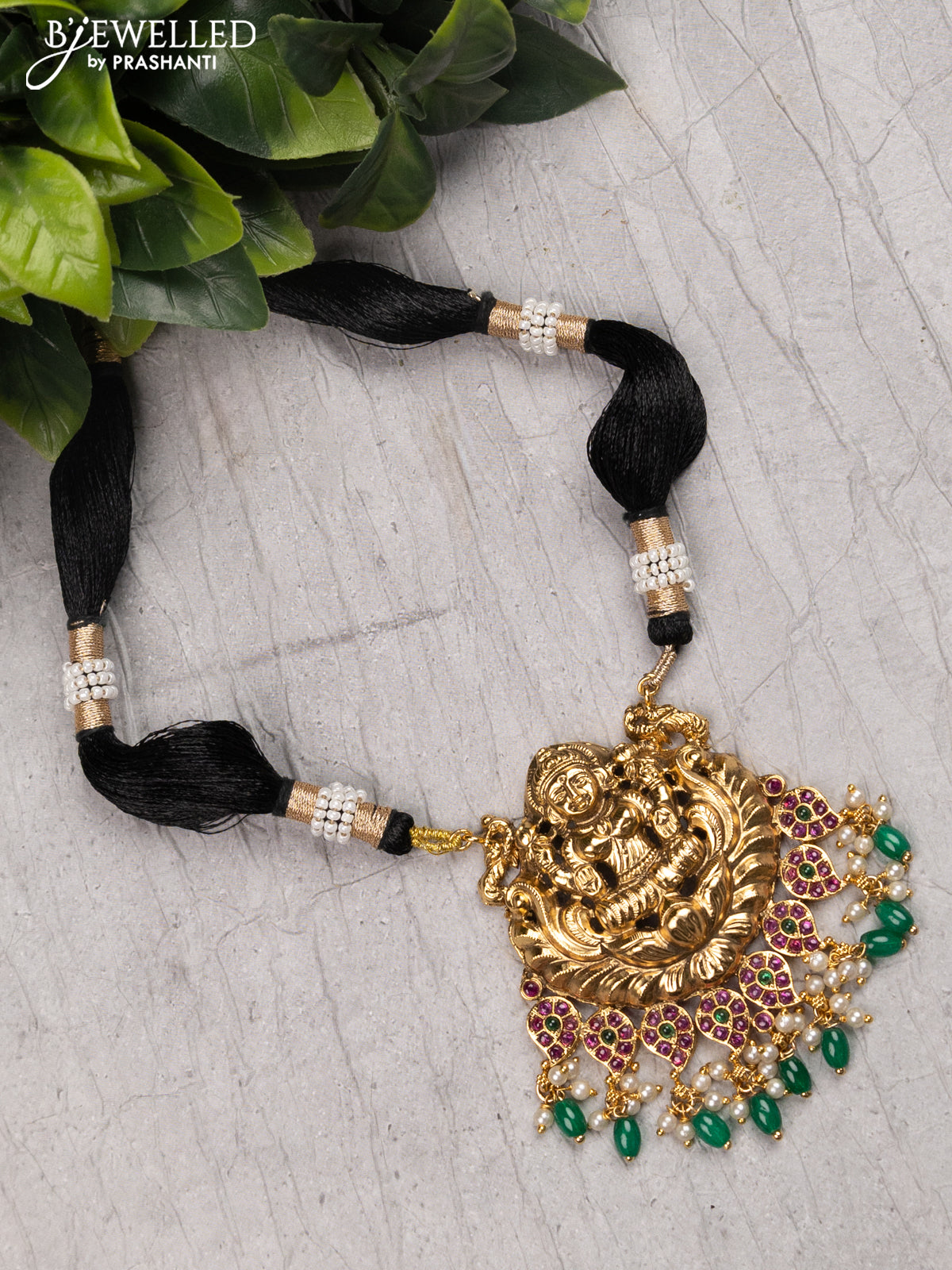 Black thread necklace with kemp stone lakshmi pendant and green beads hanging without earrings
