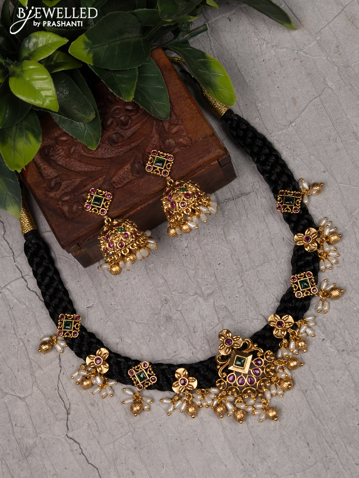 Black thread necklace with kemp stones and pearl & golden beads hangings