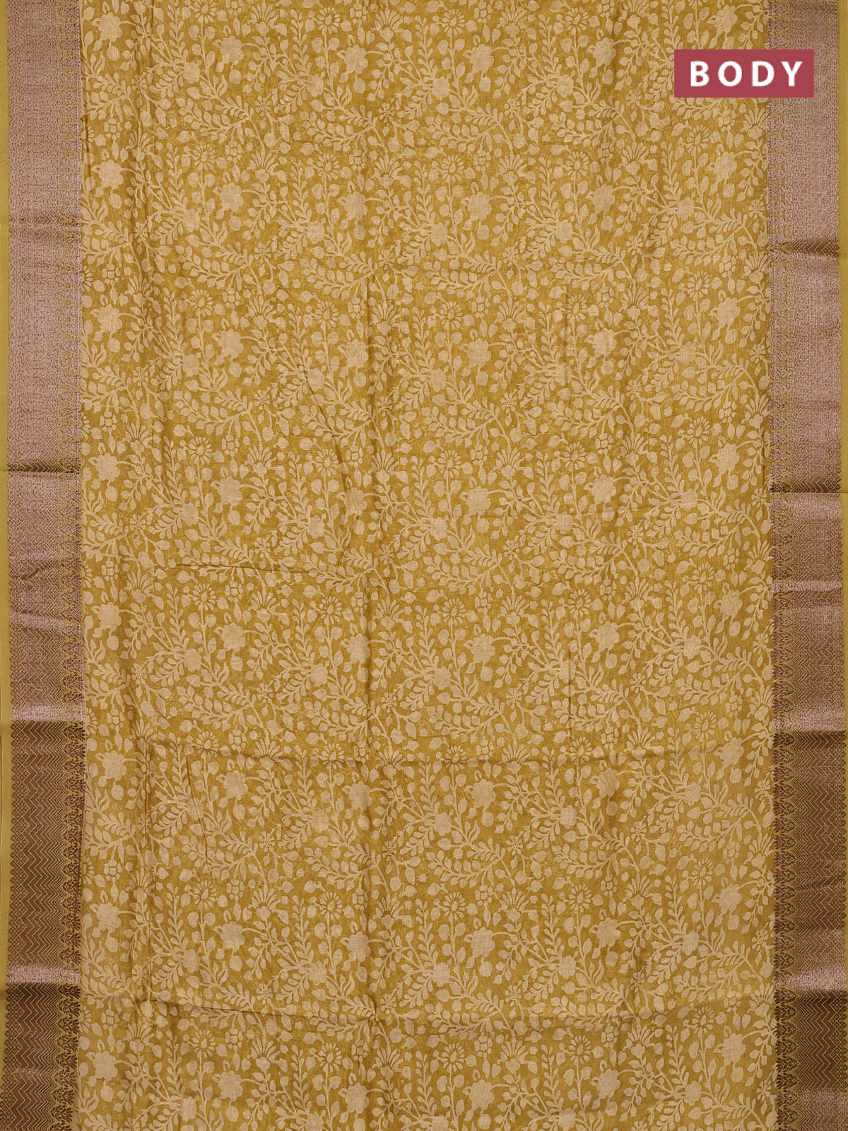 Chanderi silk cotton saree mustard shade with allover floral prints and banarasi style border