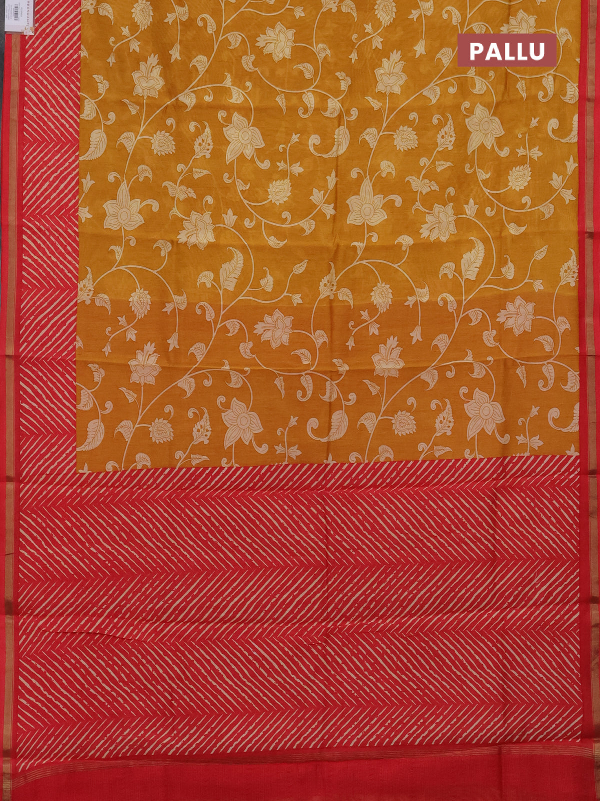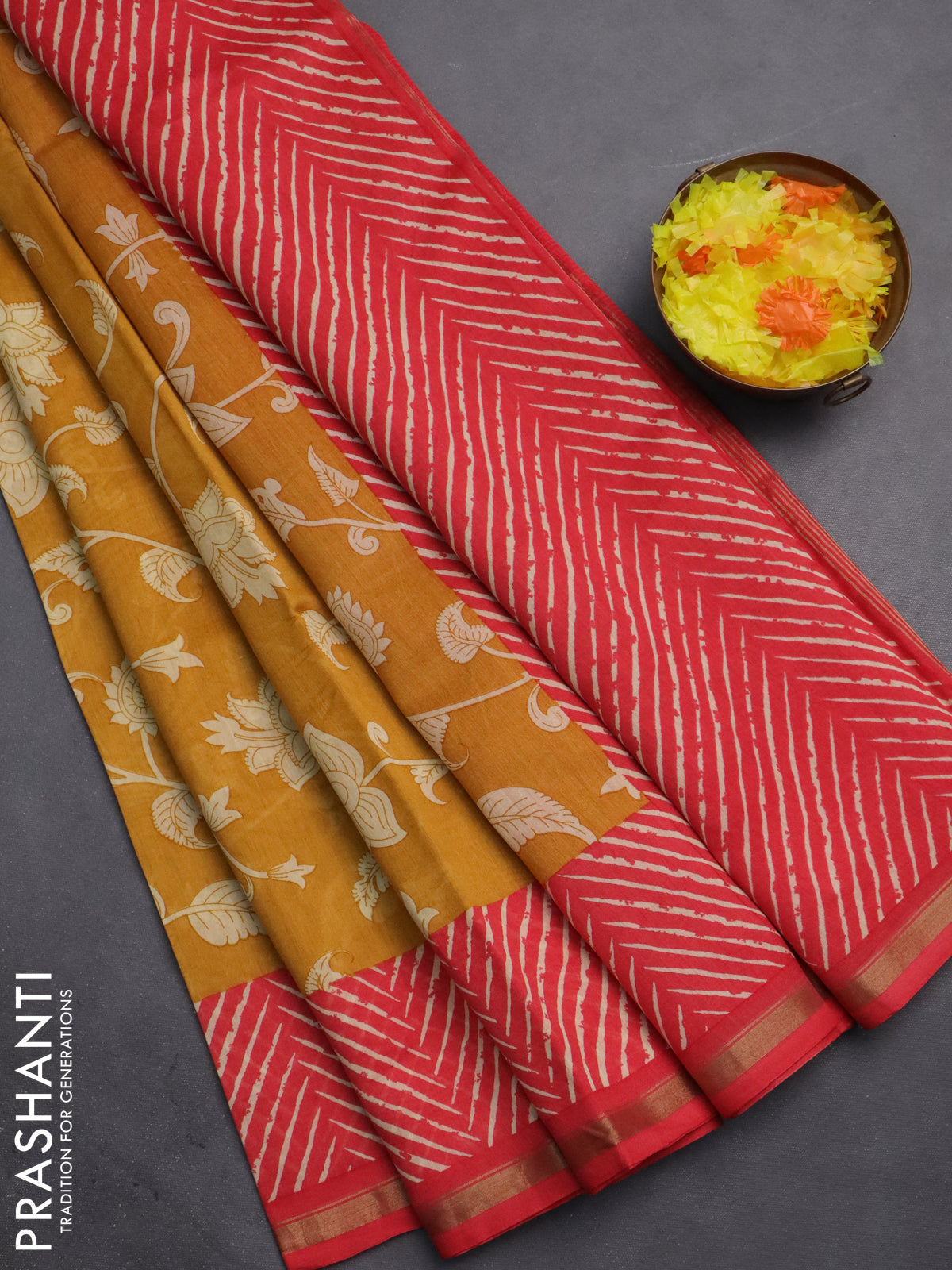 Chanderi silk cotton saree mustard yellow and red with allover kalmakari prints and zari woven border