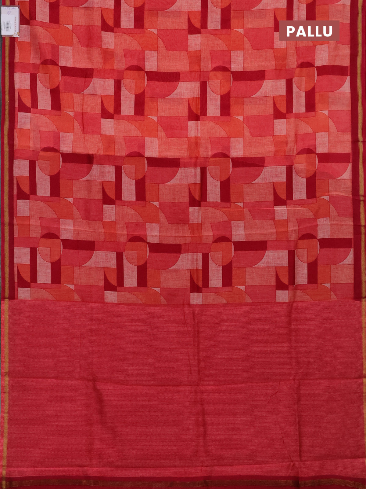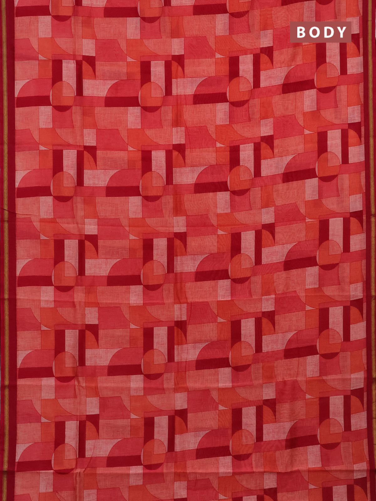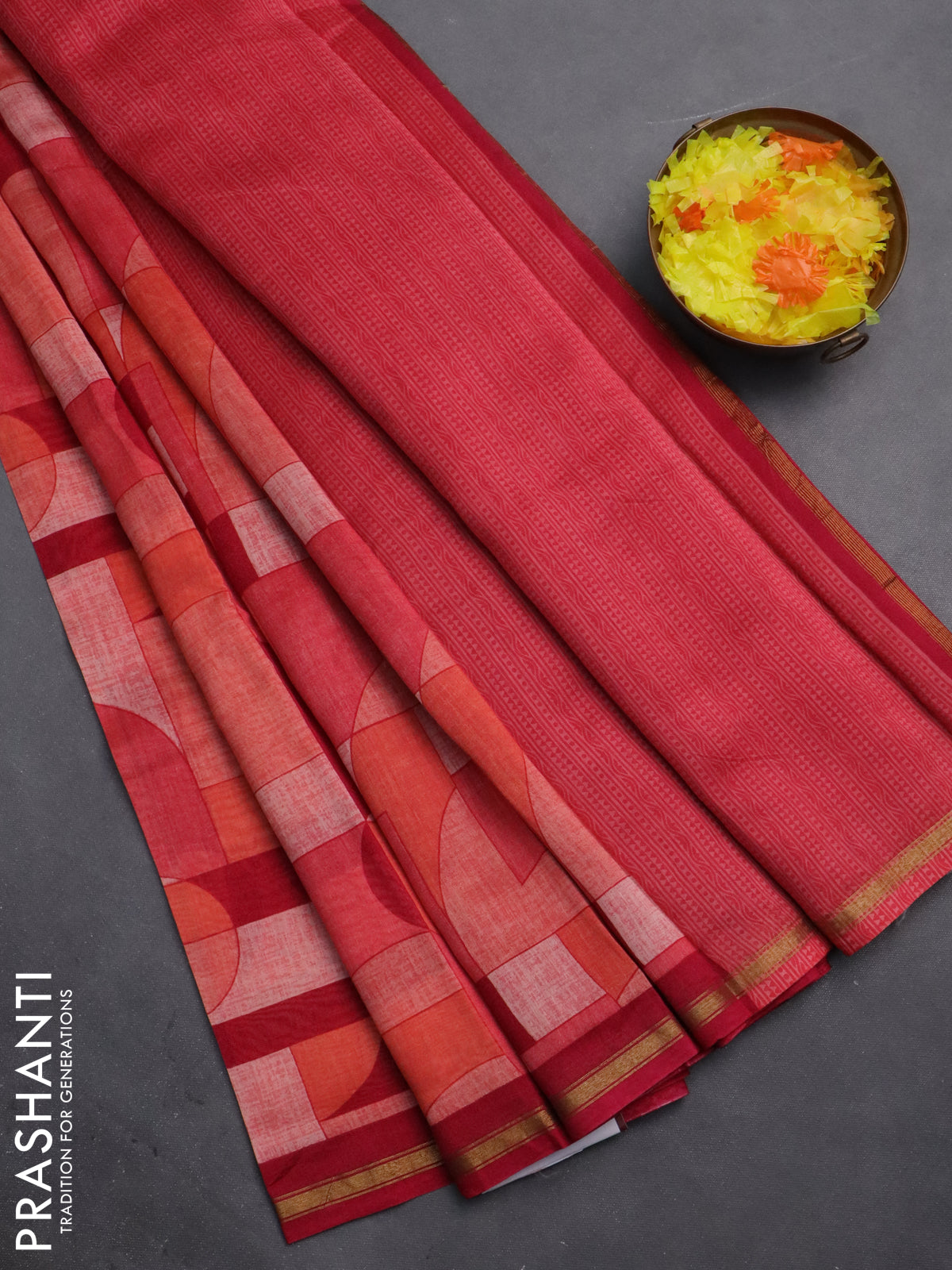 Chanderi silk cotton saree orange red and dark magenta pink with allover geometric prints and small zari woven border
