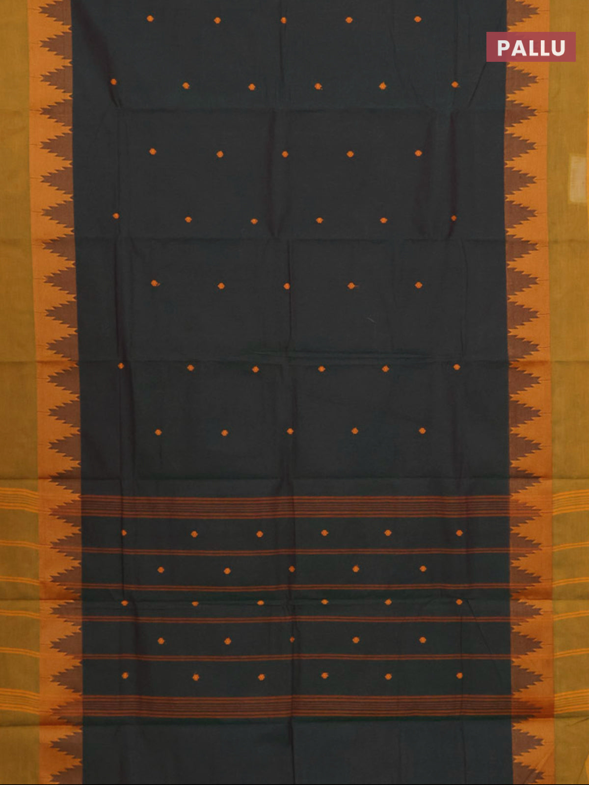 Chettinad cotton saree bottle green and dark mustard with thread woven buttas and temple thread woven simple border