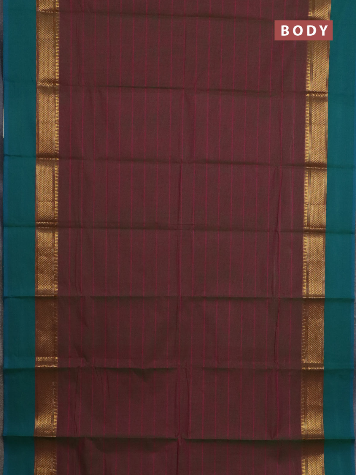 Chettinad cotton saree dual shade of maroon and teal green with allover stripe pattern and ganga jamuna border