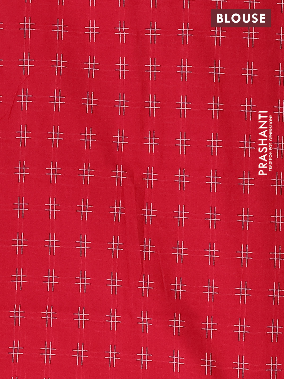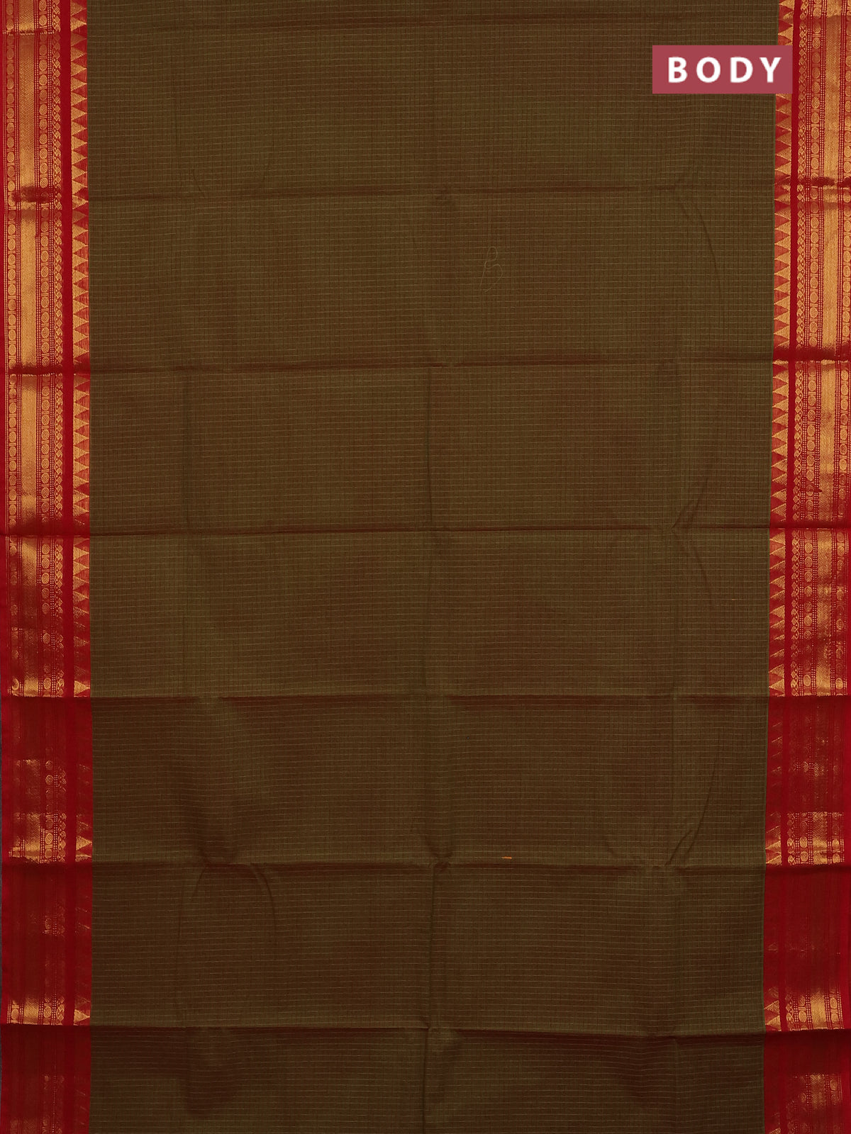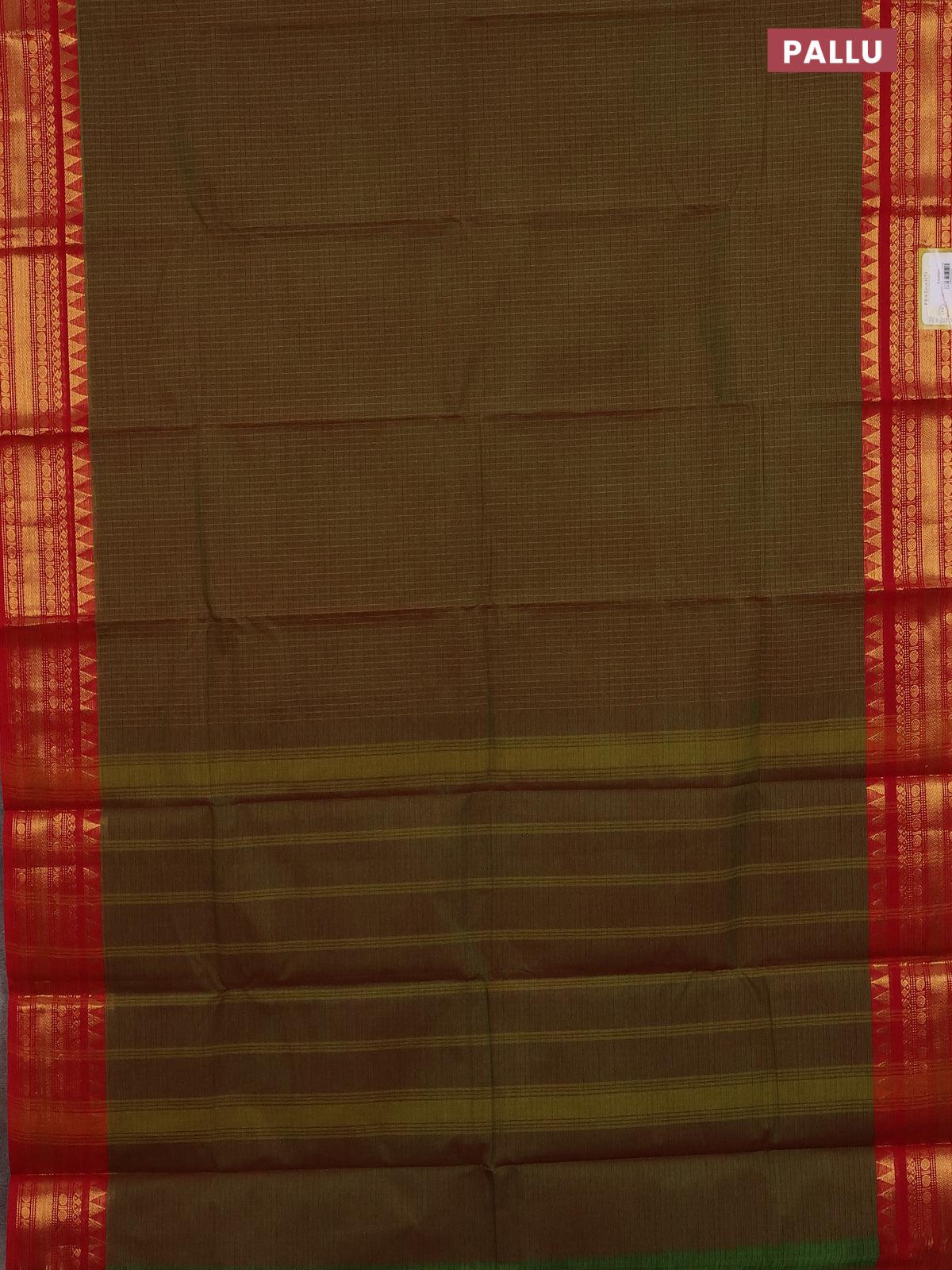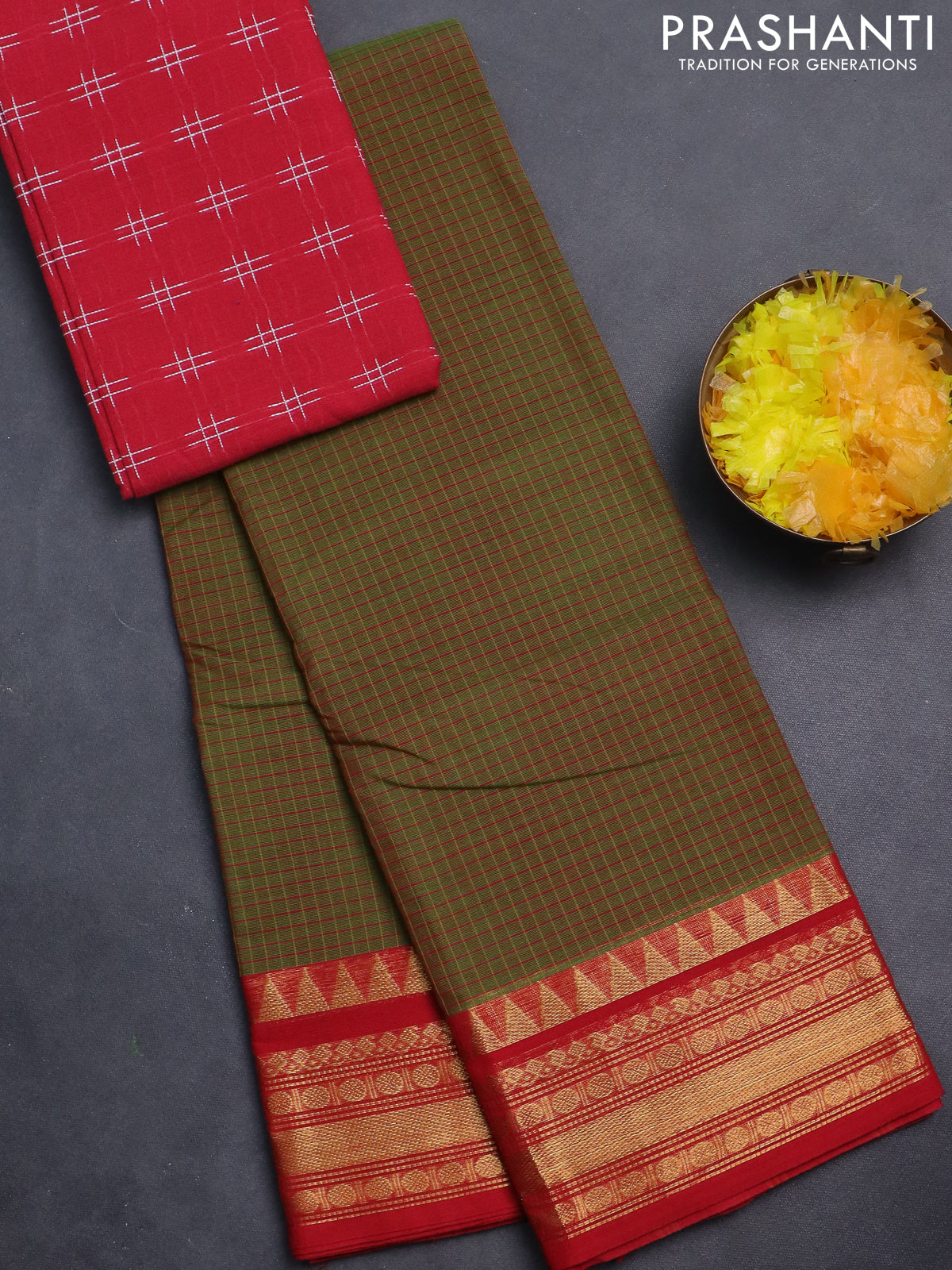 Chettinad cotton saree dual shade of sap green and red with allover checked pattern and zari woven border