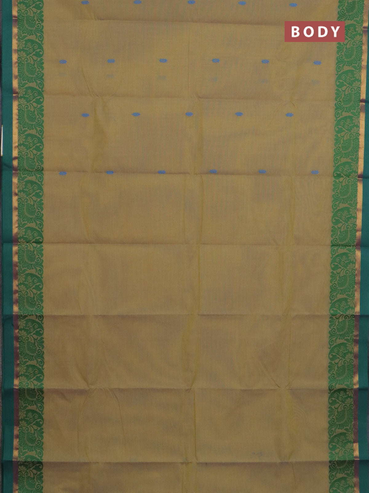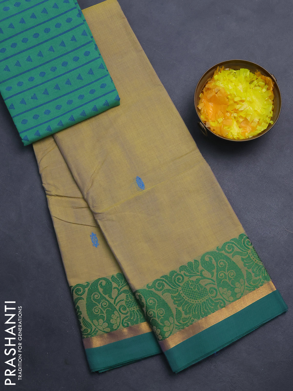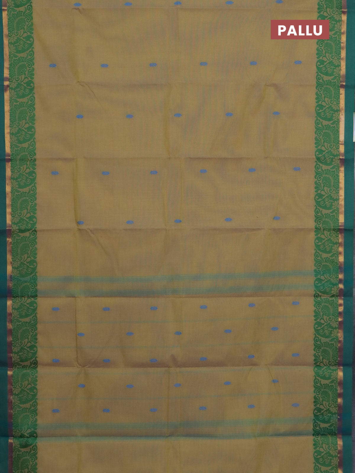 Chettinad cotton saree dual shade of yellow and teal blue with thread woven buttas and thread & zari woven border