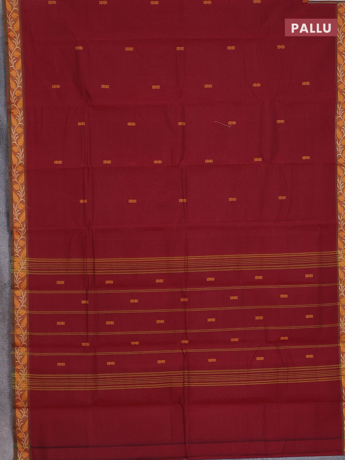 Chettinad cotton saree maroon and sap green with thread woven buttas and thread woven border