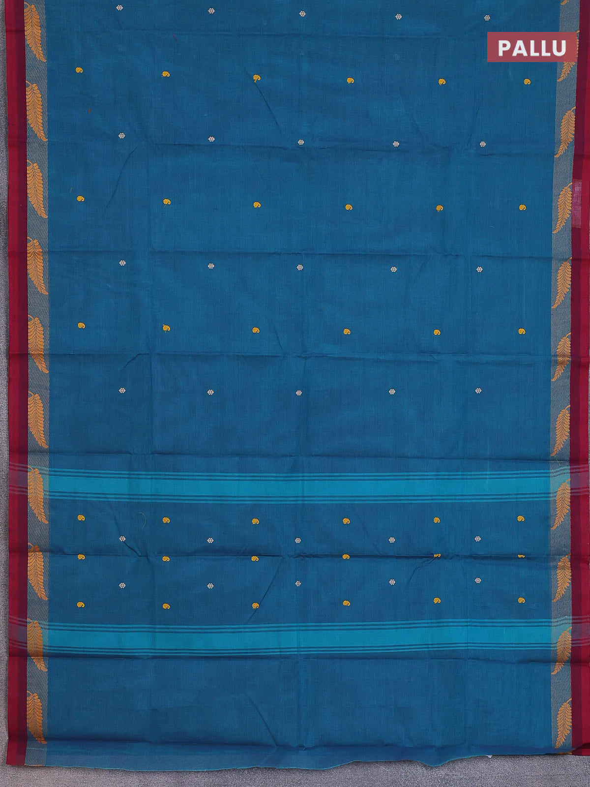 Chettinad cotton saree peacock green and maroon with thread woven buttas and thread woven simple border