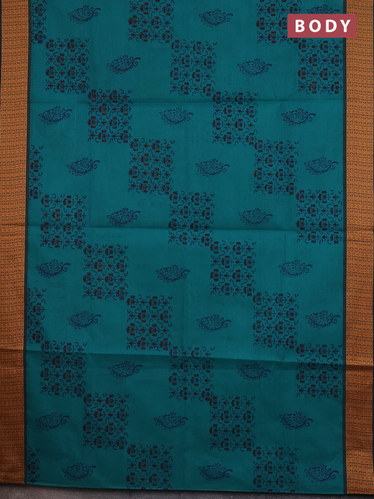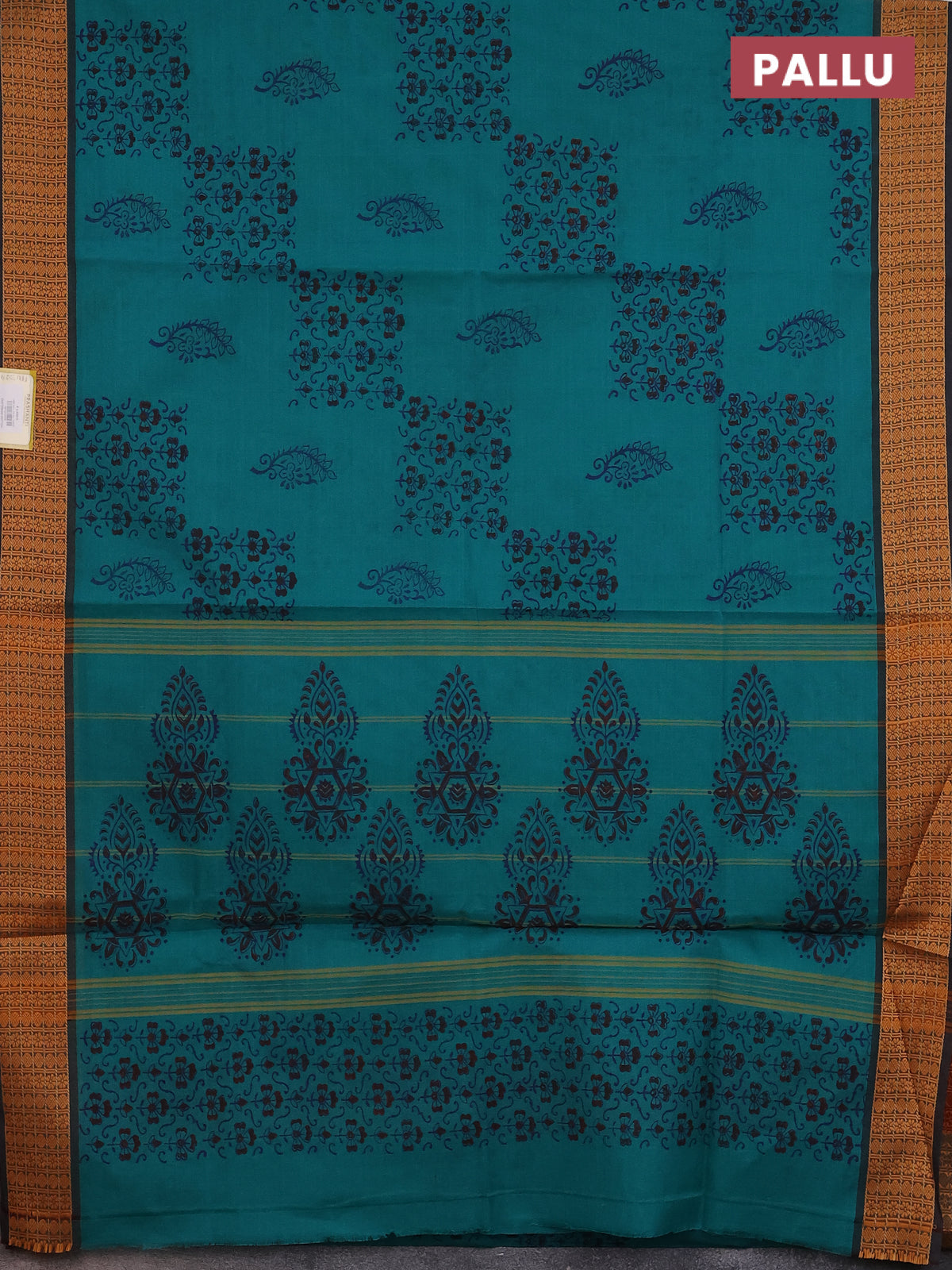 Chettinad cotton saree teal green with allover block prints and thread woven border