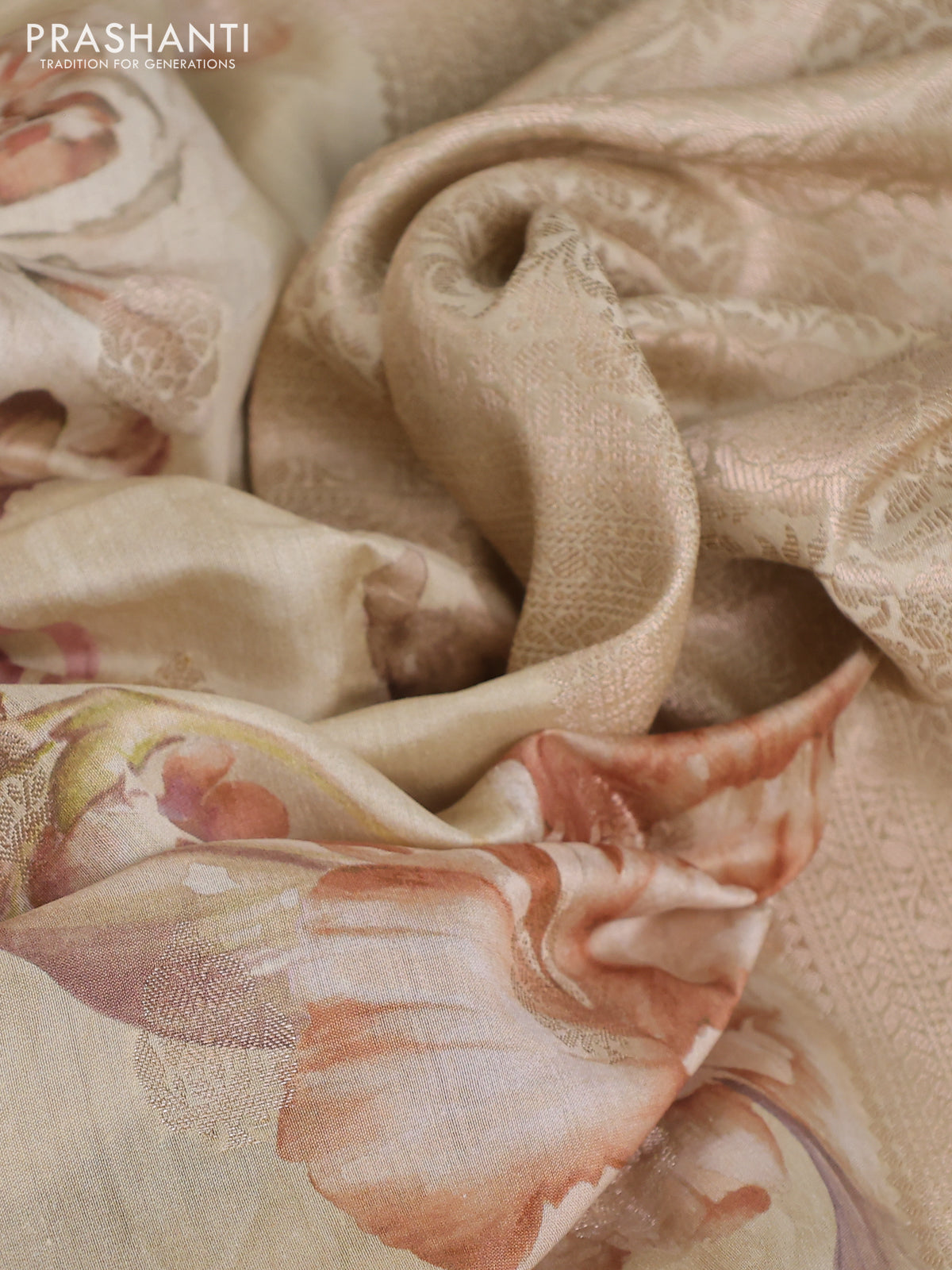 Chiniya silk saree beige with allover zari buttas & floral digital prints and zari woven border