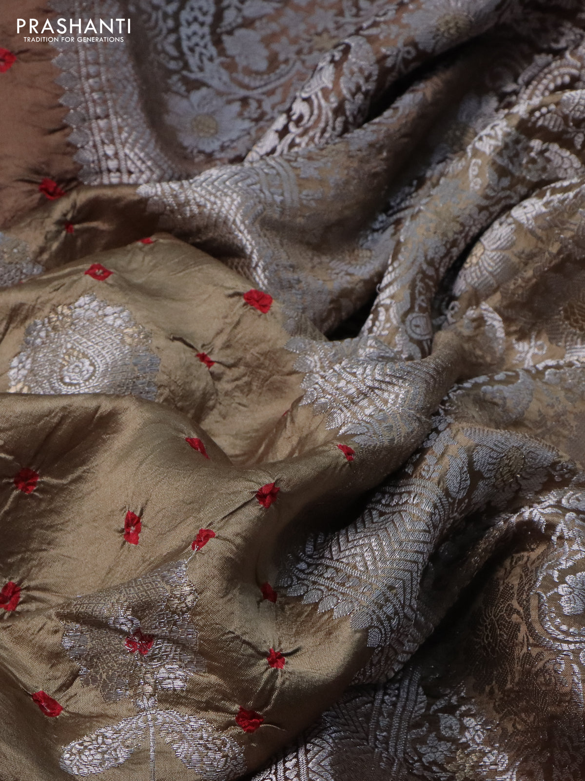 Chiniya silk saree brown with allover silver zari buttas & bandhini prints and silver zari woven border
